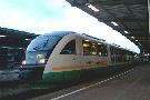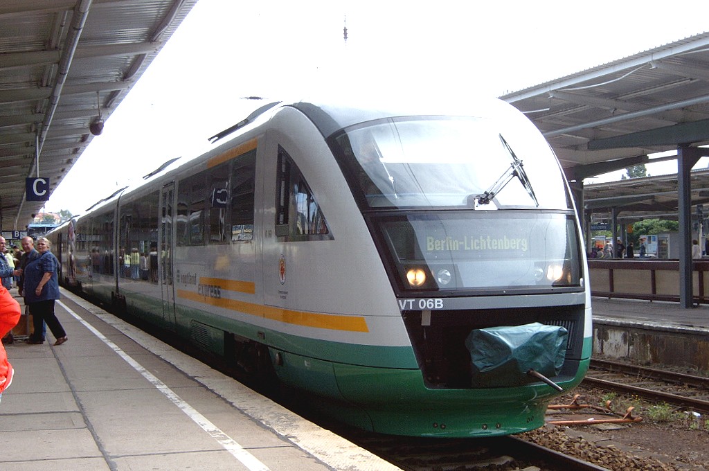 Nach dem der Vogtland-Express pünktlich 6:06 Uhr in Plauen gestartet war, erreichte er 9:49 Uhr den Bahnhof Berlin-Lichtenberg. An diesem Tag kamen VT 06 "Gemeinde Neumark im Vogtland" + VT 04 zum Einsatz (außer diesen beiden sind VT 08 und VT 23 "Stadt Zwickau" der Vogtlandbahn für den VX-Verkehr ausgerüstet). |