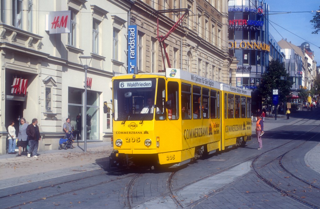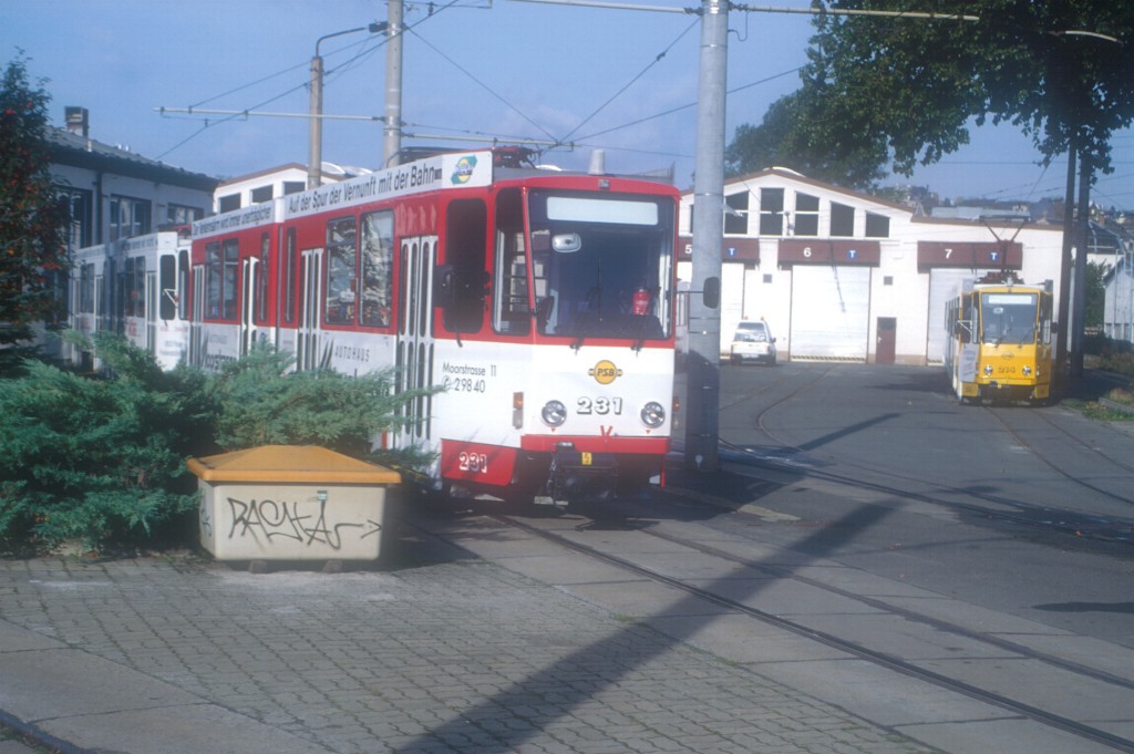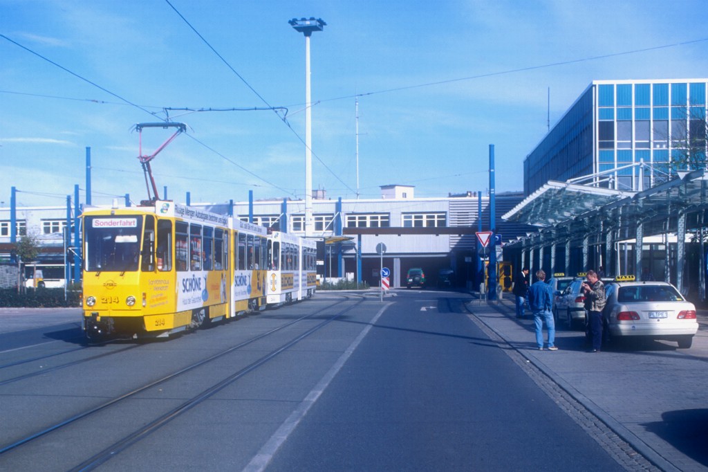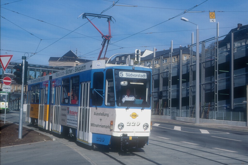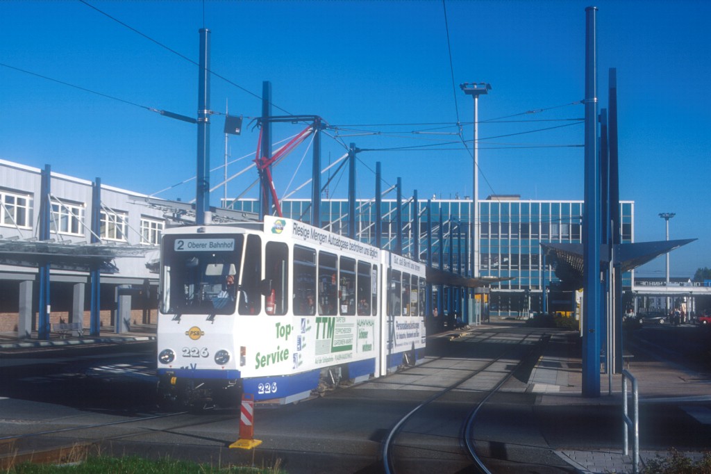 Tw 226 verlässt die Haltestelle Oberer Bahnhof/Busbahnhof, bevor er die Endhaltestelle Oberer Bahnhof/Stadtpark erreicht.