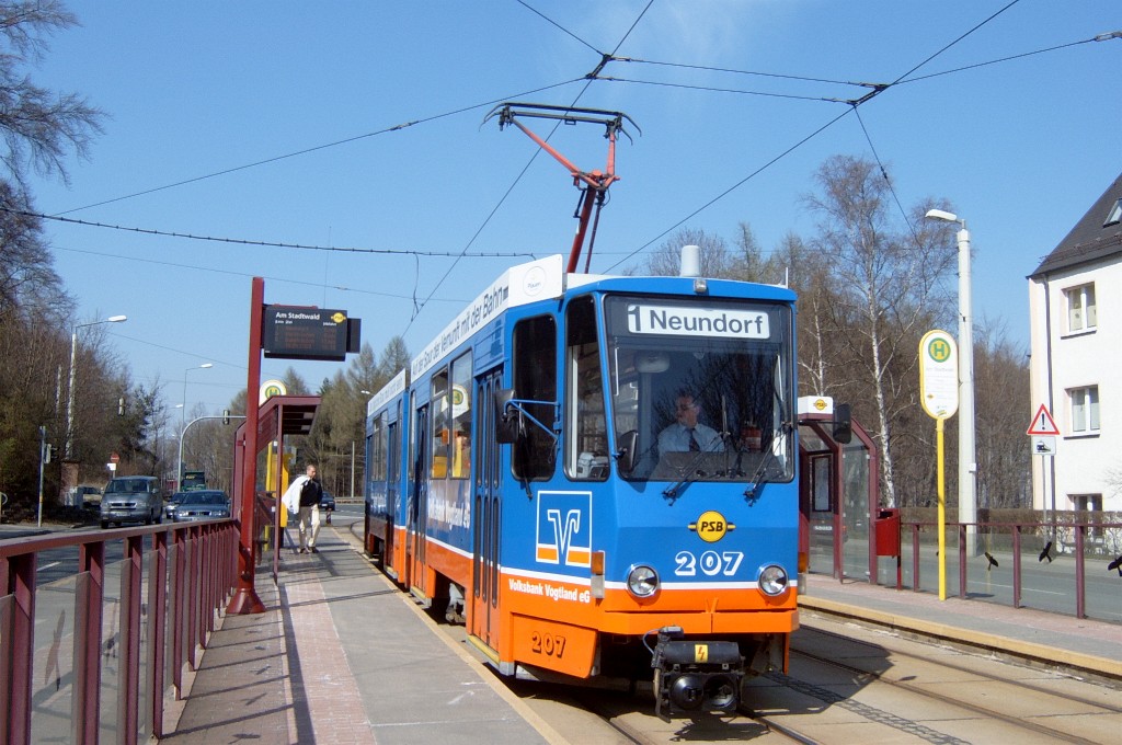 der Linie 1 nach Neundorf und hält an der Haltestelle Am Stadtwald. |