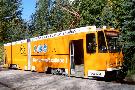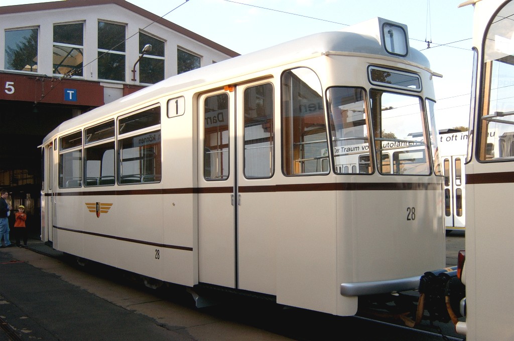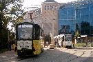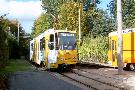 (H)Tw 215 mit dem Original-Eröffnungsschild von 1983, dass damals der Tw 222 trug, an der Stelle, wo einst das Band durchschnitten wurde (dahinter HTw 79 + HBw 28), vgl. "Foto des Monats Juni 2003". |