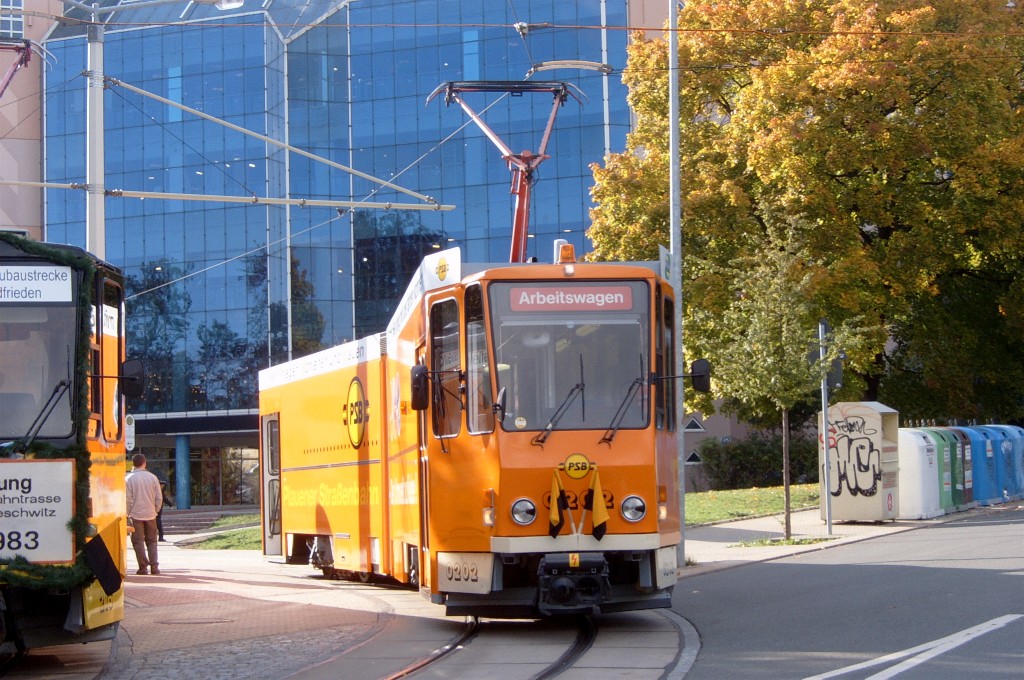 (H)Tw 215 und ATw 0202 an der Endhaltestelle Neundorf am Rosa-Luxemburg-Platz (im Hintergrund der markante "Möbel Biller"-Komplex). |