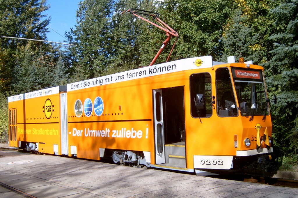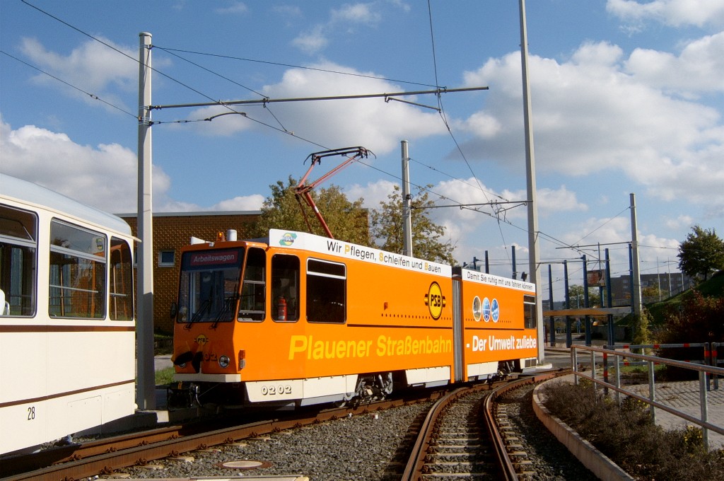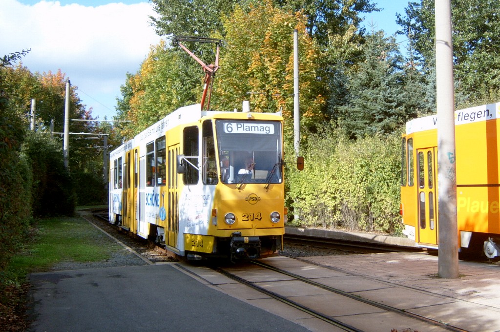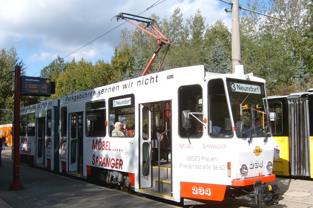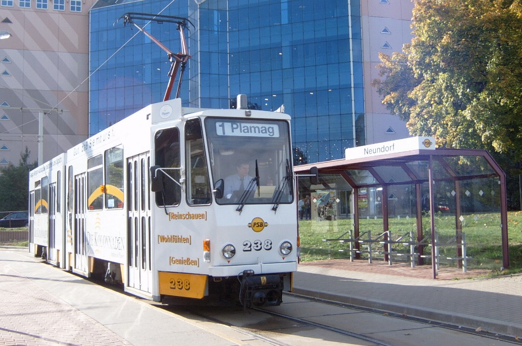 Tw 238 verlässt die Endhaltestelle Neundorf zur Plamag. |