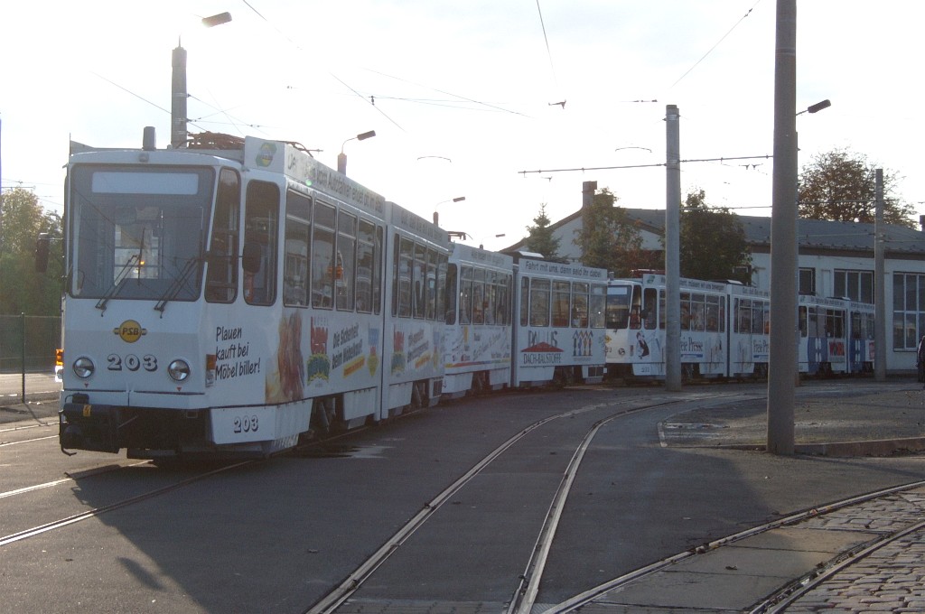 Tw 203 + Tw 204 und Tw 211 + Tw 221 im Betriebshof Wiesenstraße. |