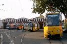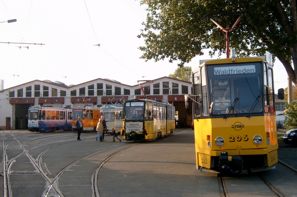 Wagenparade mit Tw 206, (H)Tw 215, HTw 79 + HBw 28, ATw 0202 und Tw 233 (v.r.n.l.) im Betriebshof Wiesenstraße. |