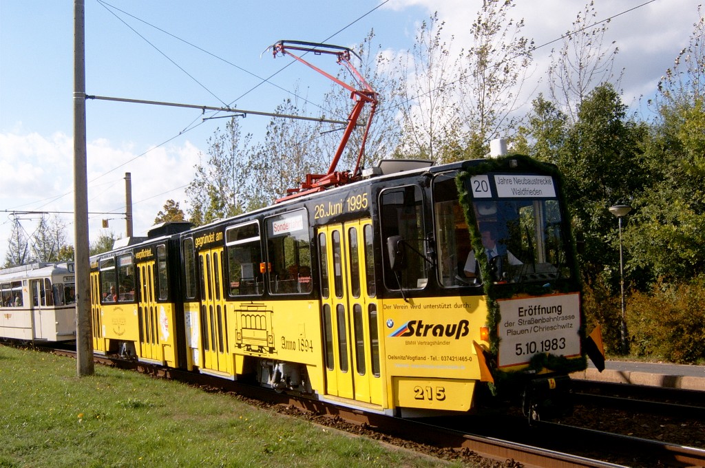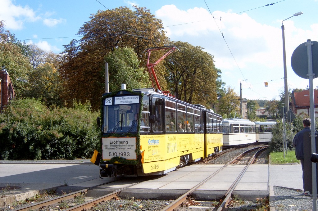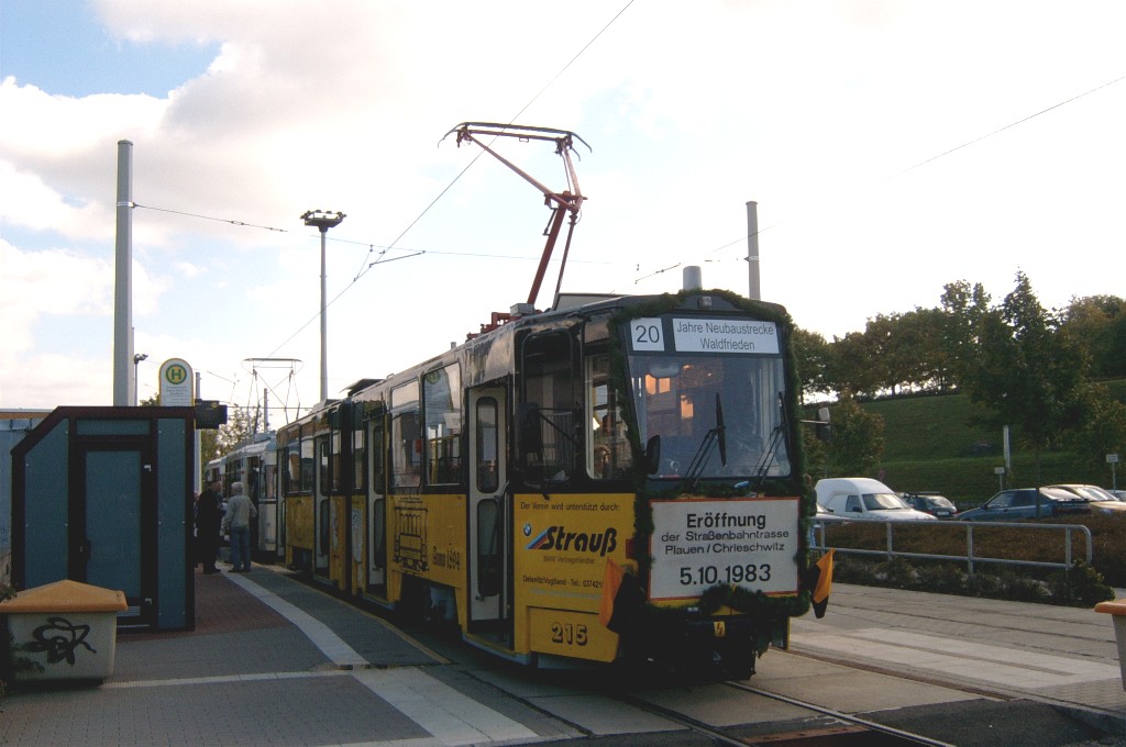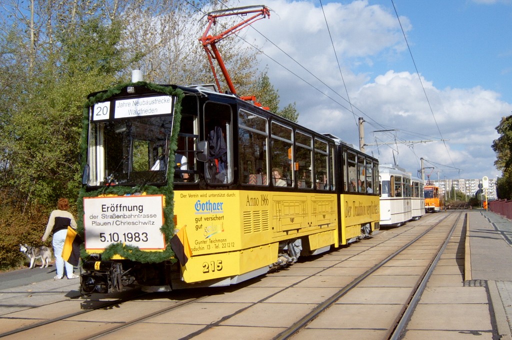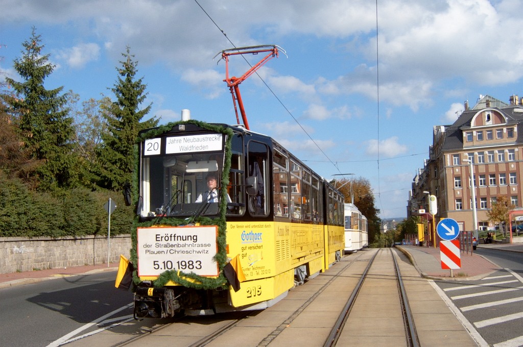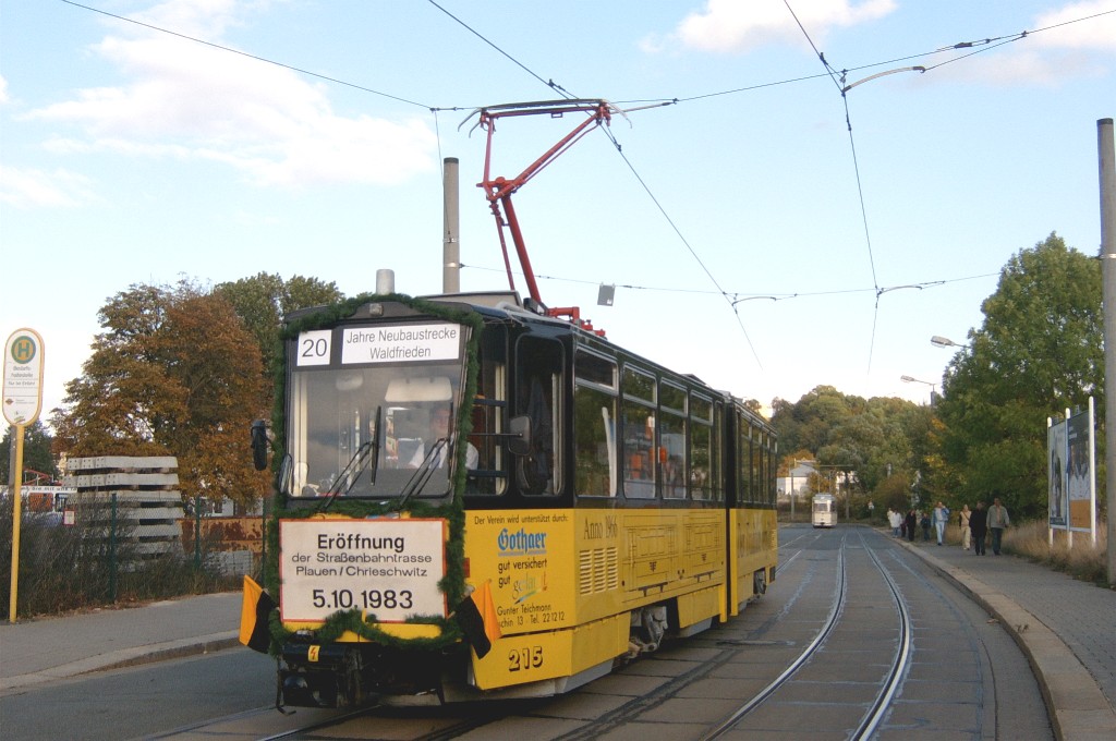 Anlässlich des Jubiläums "20 Jahre Neubaustrecke Waldfrieden", die am 5. Oktober 1983 eröffnet wurde, fand am 4. Oktober 2003 eine Sonderfahrt mit dem HTw 215, dem historischen Gotha-Zug HTw 79 + HBw 28 und dem ATw 0202 statt. Diese nahm am Oberen Bahnhof ihren Anfang, führte nach Waldfrieden, von dort aus nach Neundorf und in den Betriebshof Wiesenstraße. Während der Fahrt gab es einige Fotohalte, Stadtbilderklärung und Wissenswertes über die Strecke entlang des Neubaugebietes Chrieschwitzer Hang nach Waldfrieden zu erfahren. Kurz nach 17:00 Uhr fuhr dann der (H)Tw 215 vom Betriebshof zum Oberen Bahnhof, wo die Fahrt für eine Vielzahl von Teilnehmern endete.