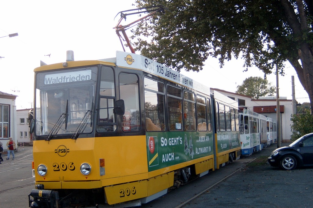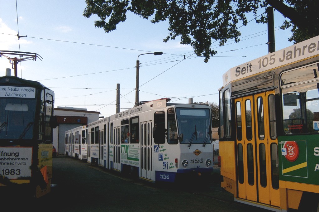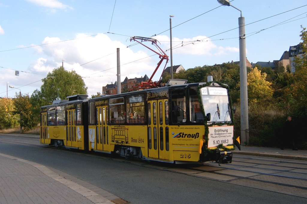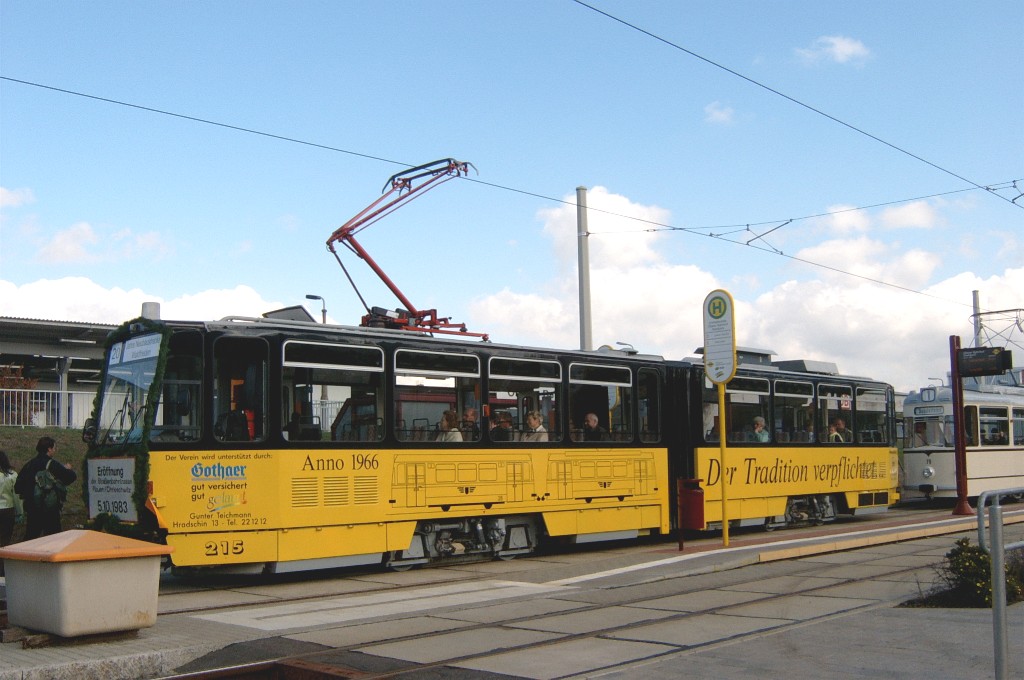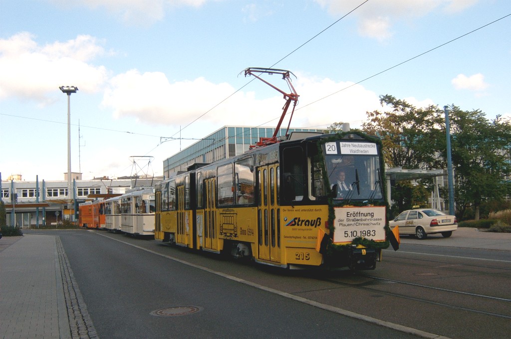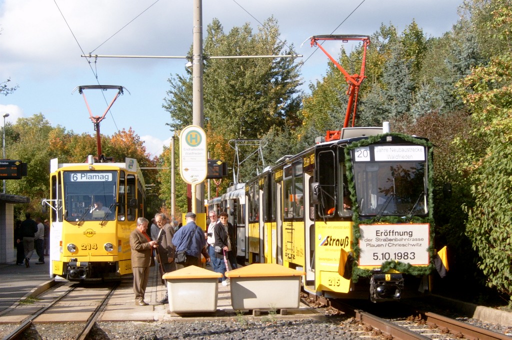 Anlässlich des Jubiläums "20 Jahre Neubaustrecke Waldfrieden", die am 5. Oktober 1983 eröffnet wurde, fand am 4. Oktober 2003 eine Sonderfahrt mit dem HTw 215, dem historischen Gotha-Zug HTw 79 + HBw 28 und dem ATw 0202 statt. Diese nahm am Oberen Bahnhof ihren Anfang, führte nach Waldfrieden, von dort aus nach Neundorf und in den Betriebshof Wiesenstraße. Während der Fahrt gab es einige Fotohalte, Stadtbilderklärung und Wissenswertes über die Strecke entlang des Neubaugebietes Chrieschwitzer Hang nach Waldfrieden zu erfahren. Kurz nach 17:00 Uhr fuhr dann der (H)Tw 215 vom Betriebshof zum Oberen Bahnhof, wo die Fahrt für eine Vielzahl von Teilnehmern endete.