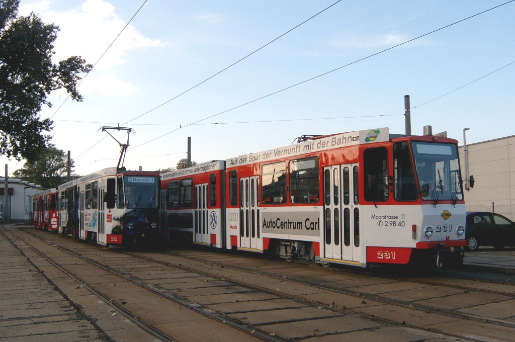 Rot-weiße Bahnen: Tw 231, Tw 218 und Tw 220 im Betriebshof Wiesenstraße (es würde nur noch der Tw 234 fehlen). |