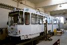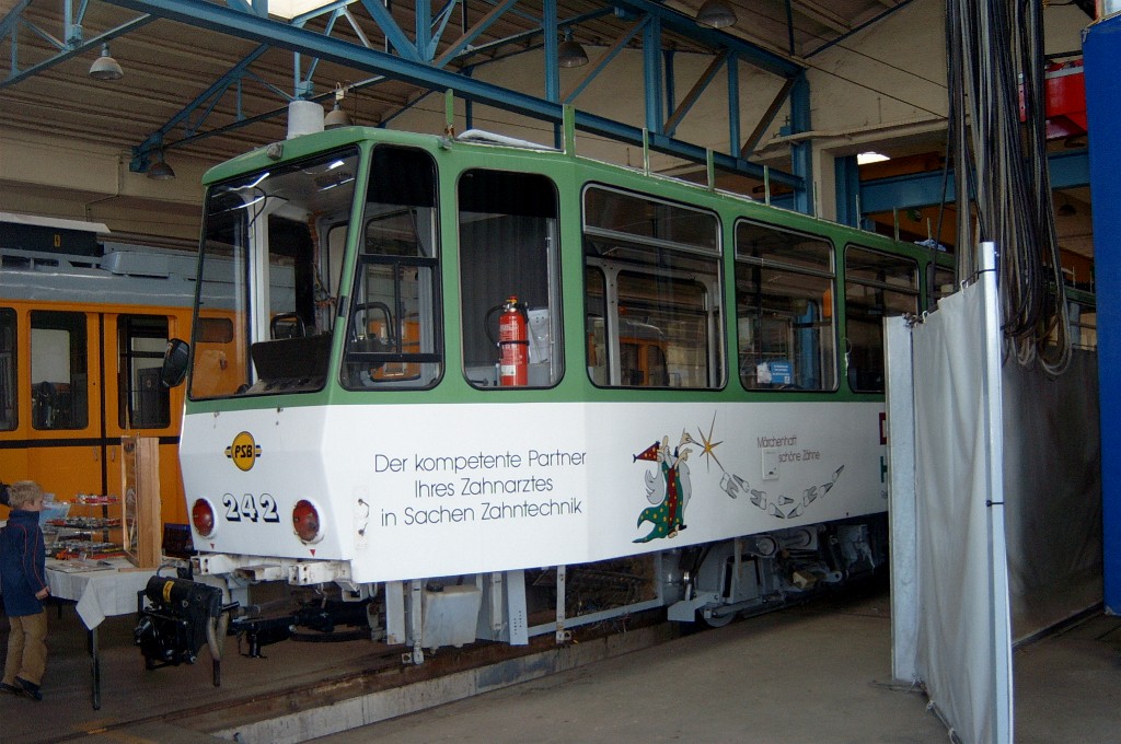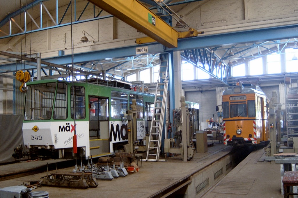 Tw 242 während einer HU im Betriebshof Wiesenstraße (links im Bild der Souvenirverkauf). |