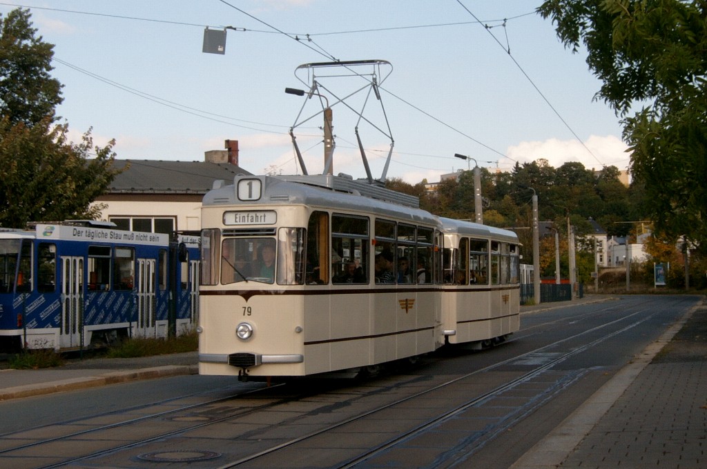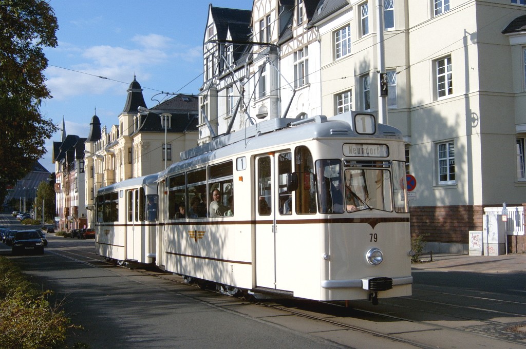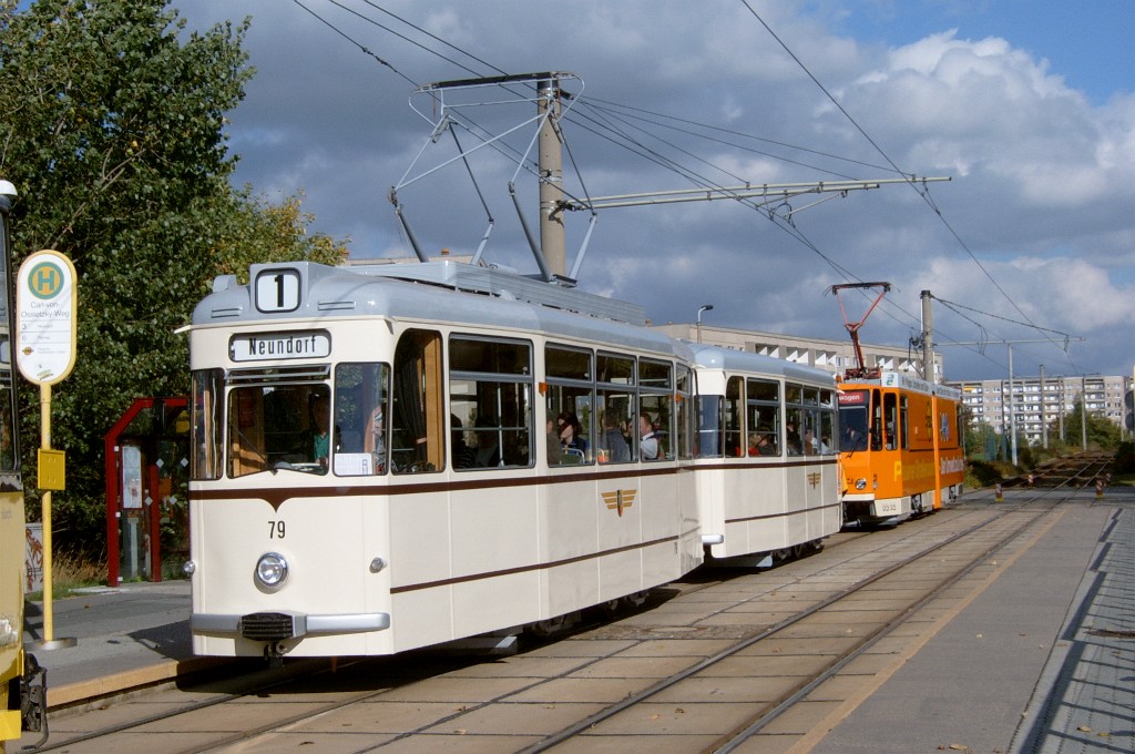 (H)Tw 215 und HTw 79 + HBw 28 während des Fotohalts an der Haltestelle Seehaus auf der Neundorfer Straße. Im Hintergrund kann man den Rathausturm erkennen. |
