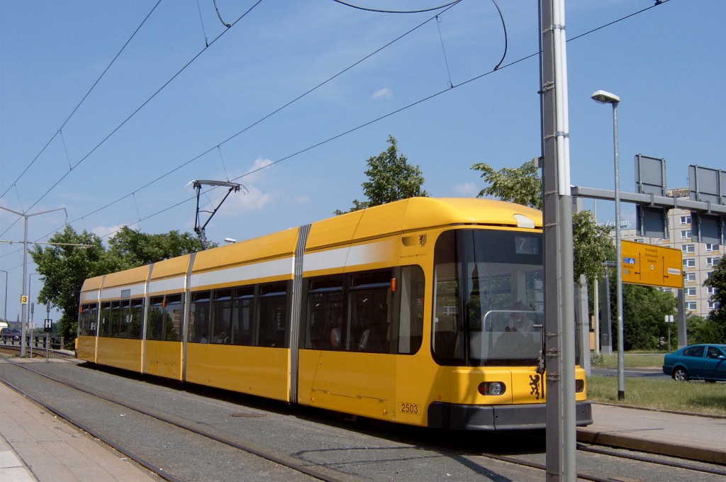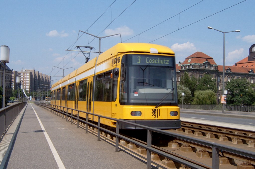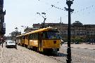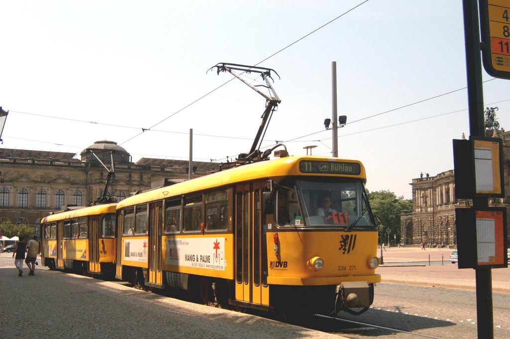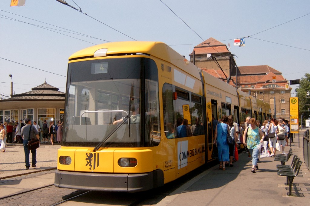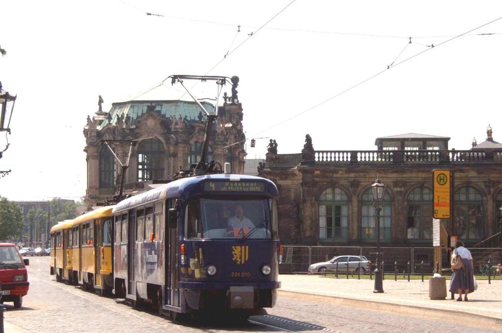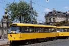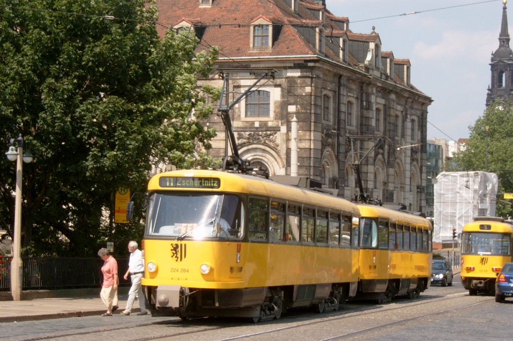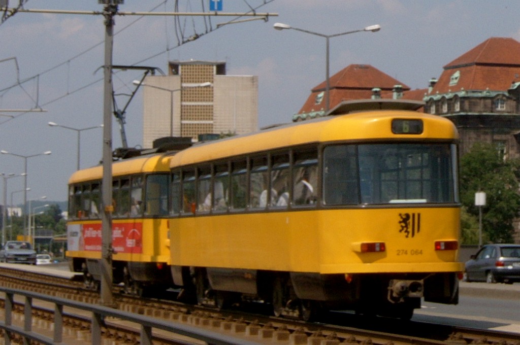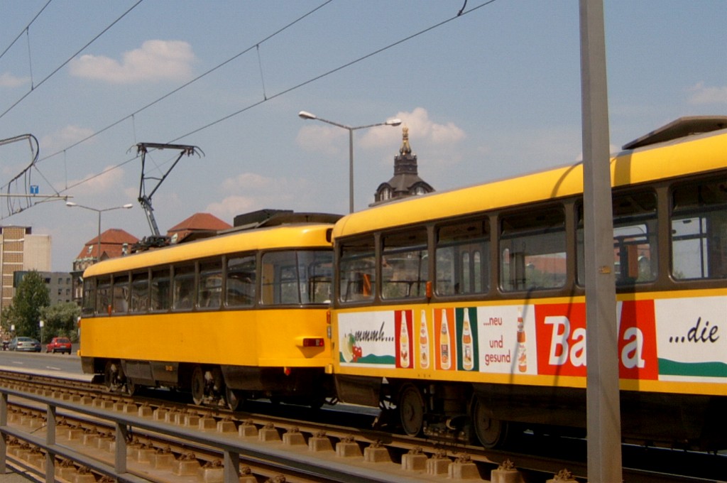 Am 04.06.2003 war ich in der sächsischen Landeshauptstadt Dresden. Hier trifft man Triebwagen der Typen T4D-MS (224 0..., 224 1...), T4D-MT (224 2...), T4D-MI (224 5...), TB4D-MS (244 0...; nur als geführter Triebwagen einsetzbar, da nur Behelfsfahrerstand vorhanden) und Beiwagen des Typs B4D-MS (274 0...) sowohl Niederflurtriebwagen der Typen NGT6DD (2501 - 2547, ZR: 2581 - 2593), NGT8DD (2701 - 2723) und ab 19.06. auch NGTD12DD (2801, 2802; in einigen Monaten bis 2820) an. (Der seit Ende September 2003 im Einsatz befindliche Tw 2805 trägt übrigens den Namen "Stadt Plauen".) (Oktober 2003)