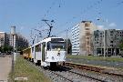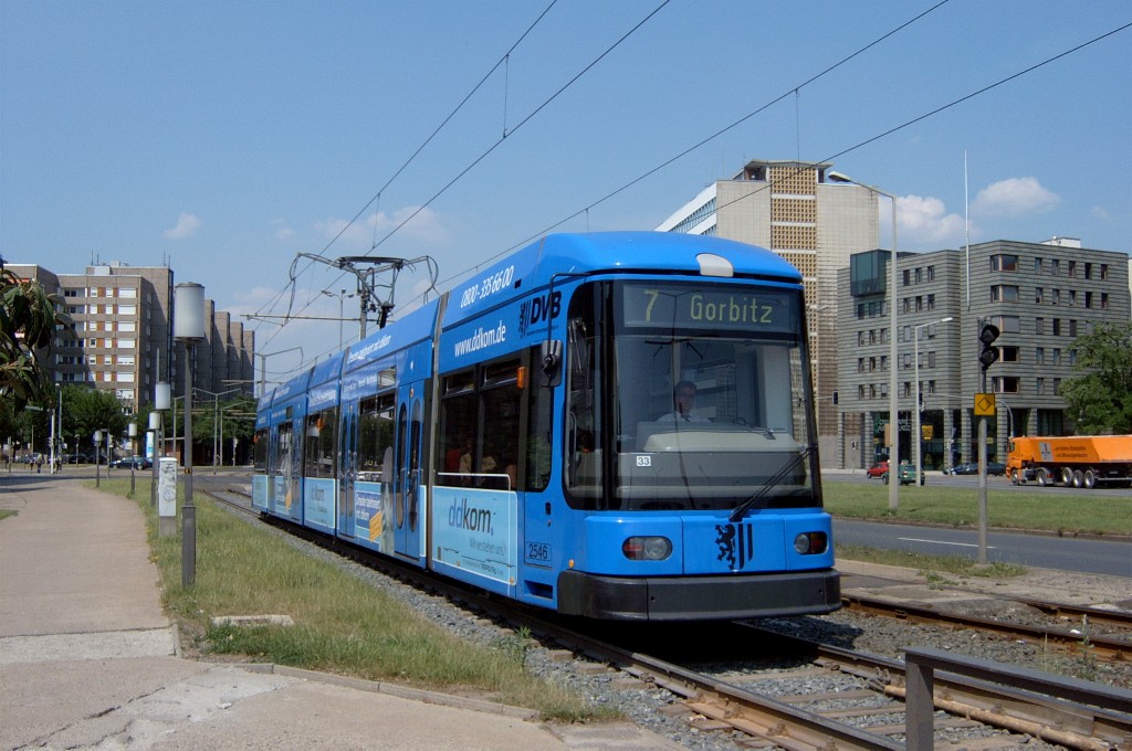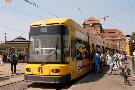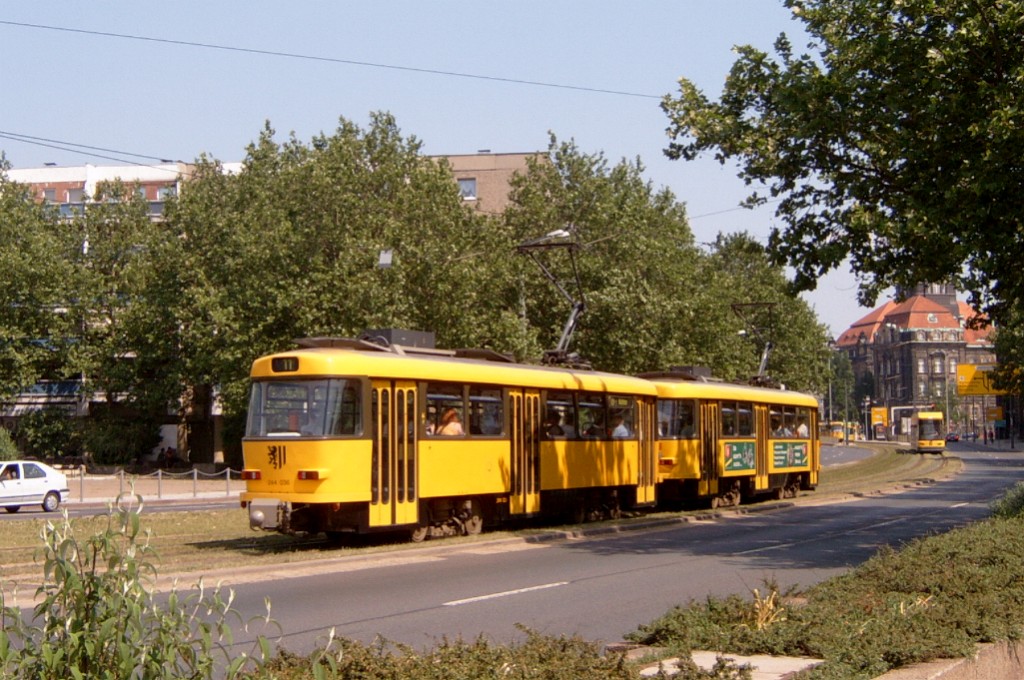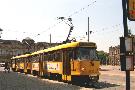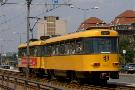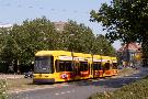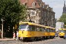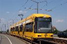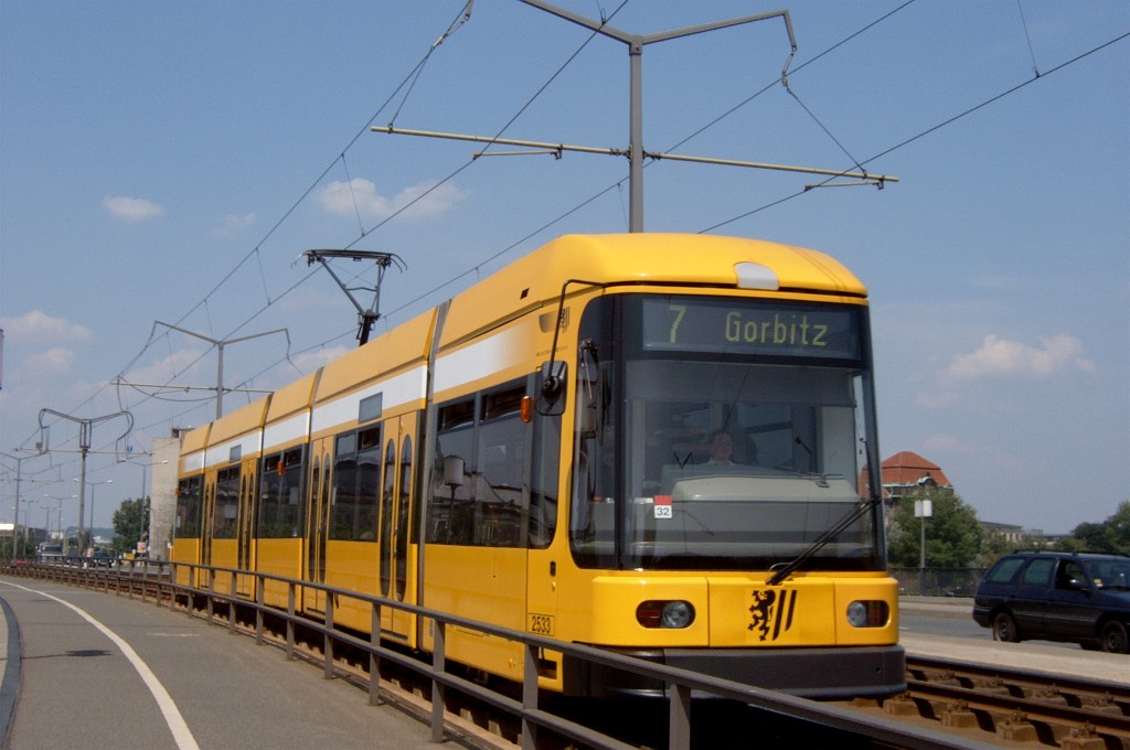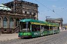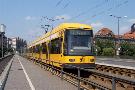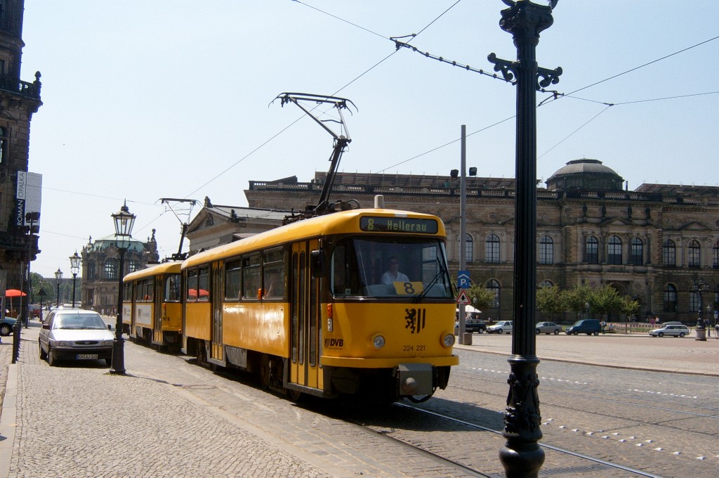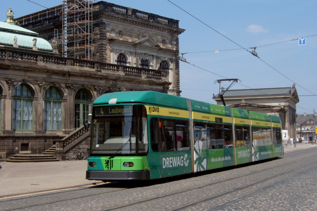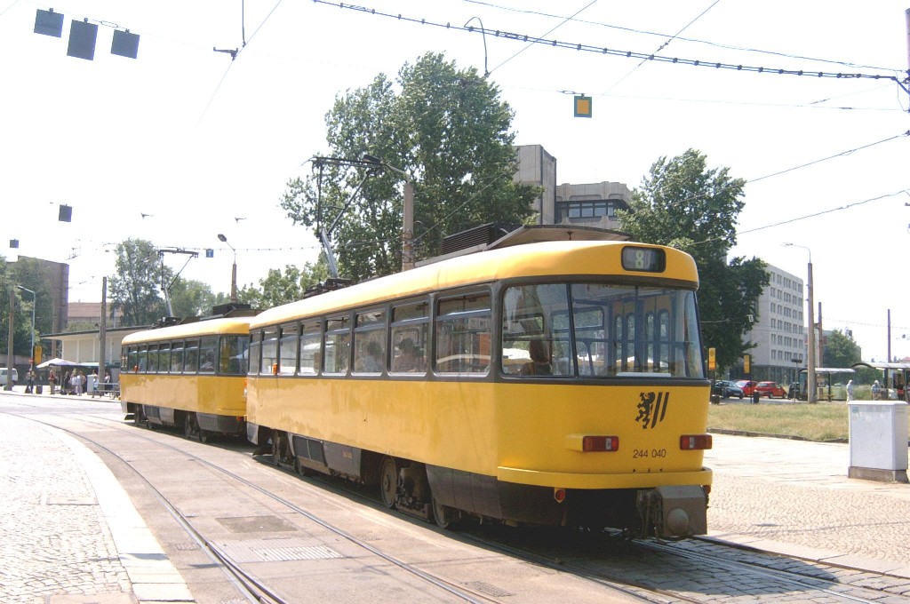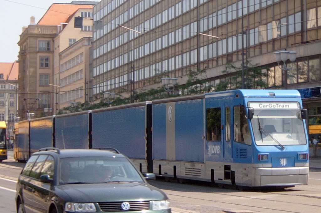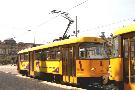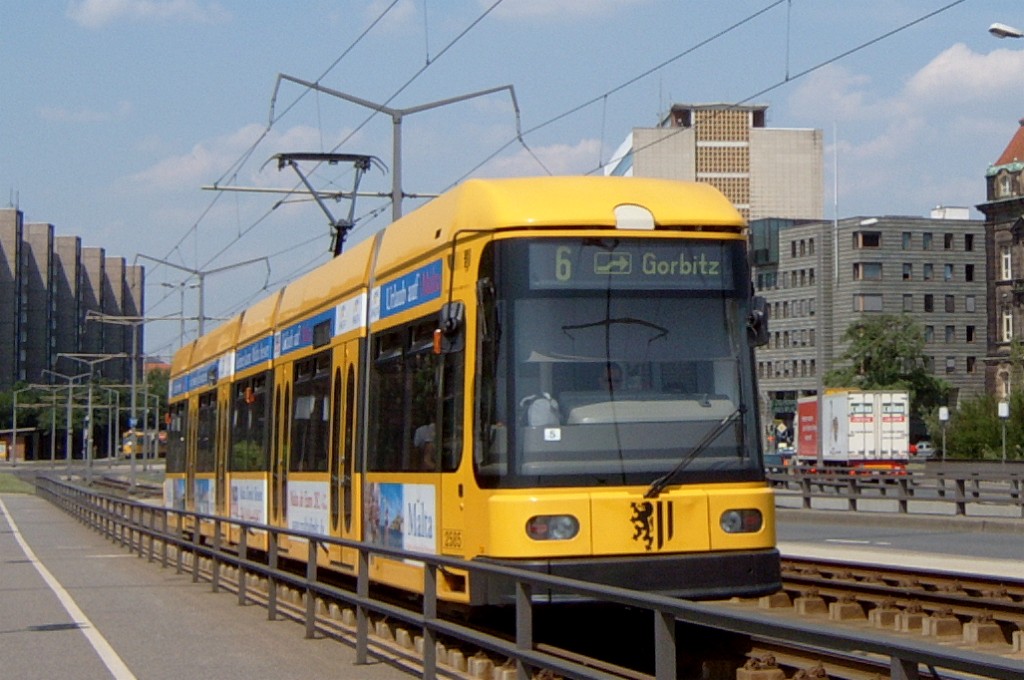 Am 04.06.2003 war ich in der sächsischen Landeshauptstadt Dresden. Hier trifft man Triebwagen der Typen T4D-MS (224 0..., 224 1...), T4D-MT (224 2...), T4D-MI (224 5...), TB4D-MS (244 0...; nur als geführter Triebwagen einsetzbar, da nur Behelfsfahrerstand vorhanden) und Beiwagen des Typs B4D-MS (274 0...) sowohl Niederflurtriebwagen der Typen NGT6DD (2501 - 2547, ZR: 2581 - 2593), NGT8DD (2701 - 2723) und ab 19.06. auch NGTD12DD (2801, 2802; in einigen Monaten bis 2820) an. (Der seit Ende September 2003 im Einsatz befindliche Tw 2805 trägt übrigens den Namen "Stadt Plauen".) (Oktober 2003)