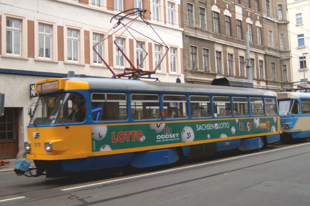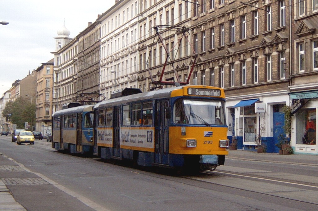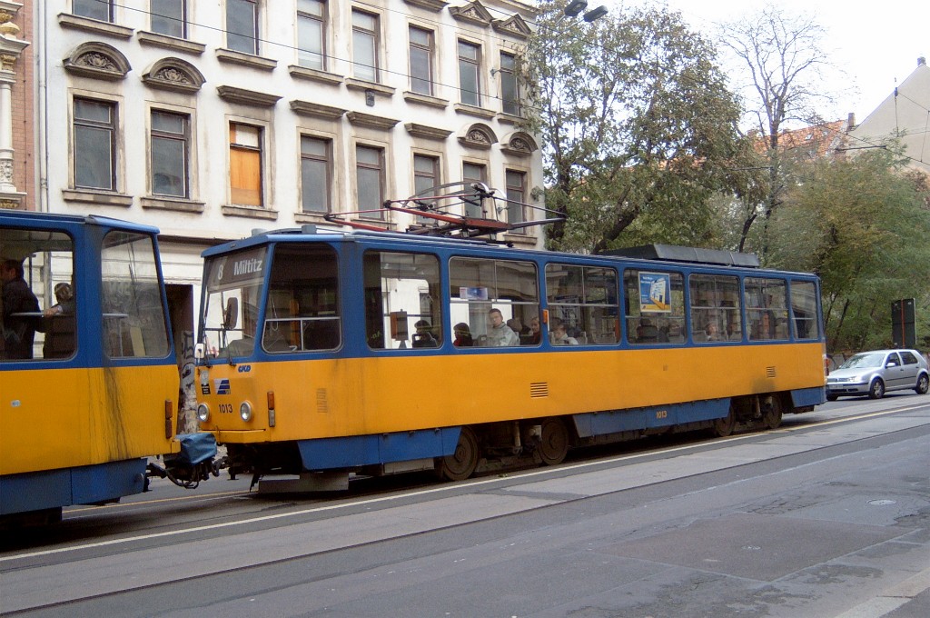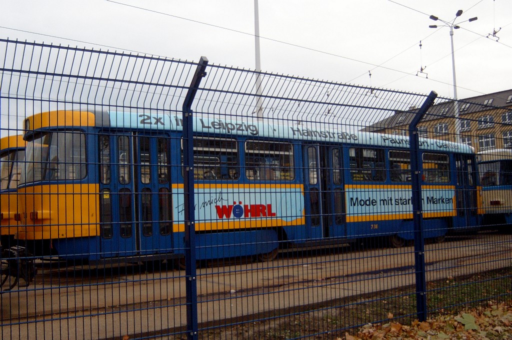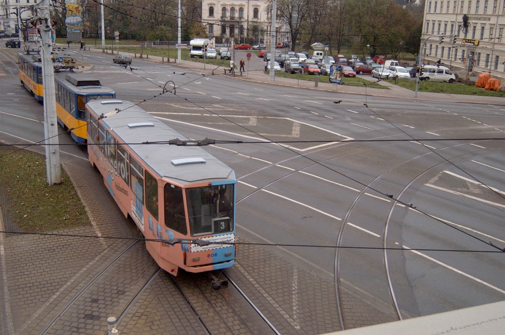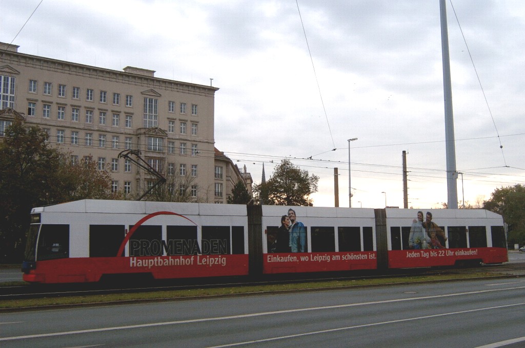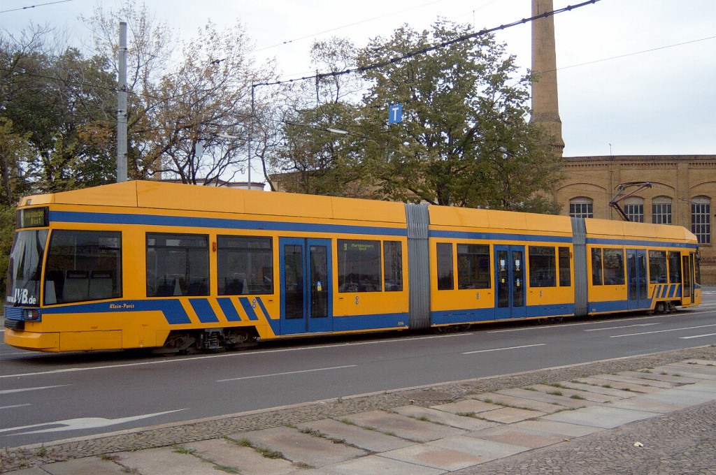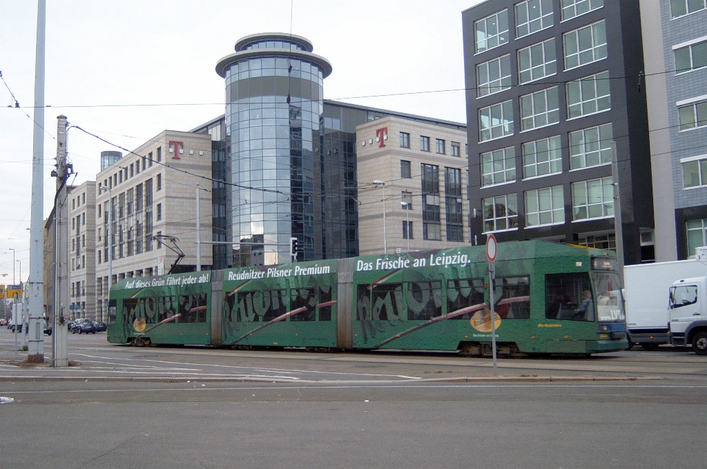 Am 29. Oktober 2003 machte ich eine Fototour durch Leipzig, auch wenn das Wetter nicht gerade das idealste war. Der Wagenpark der LVB (Leipziger Verkehrsbetriebe) umfasst Fahrzeuge der Typen T6A2/B6A2, T4D/B4D, T4D-M/B4D-M, NB4 und NGT8 sowie einige Sonder- und Arbeitsfahrzeuge. Die NGT8 tragen alle einen Namen. (November 2003)