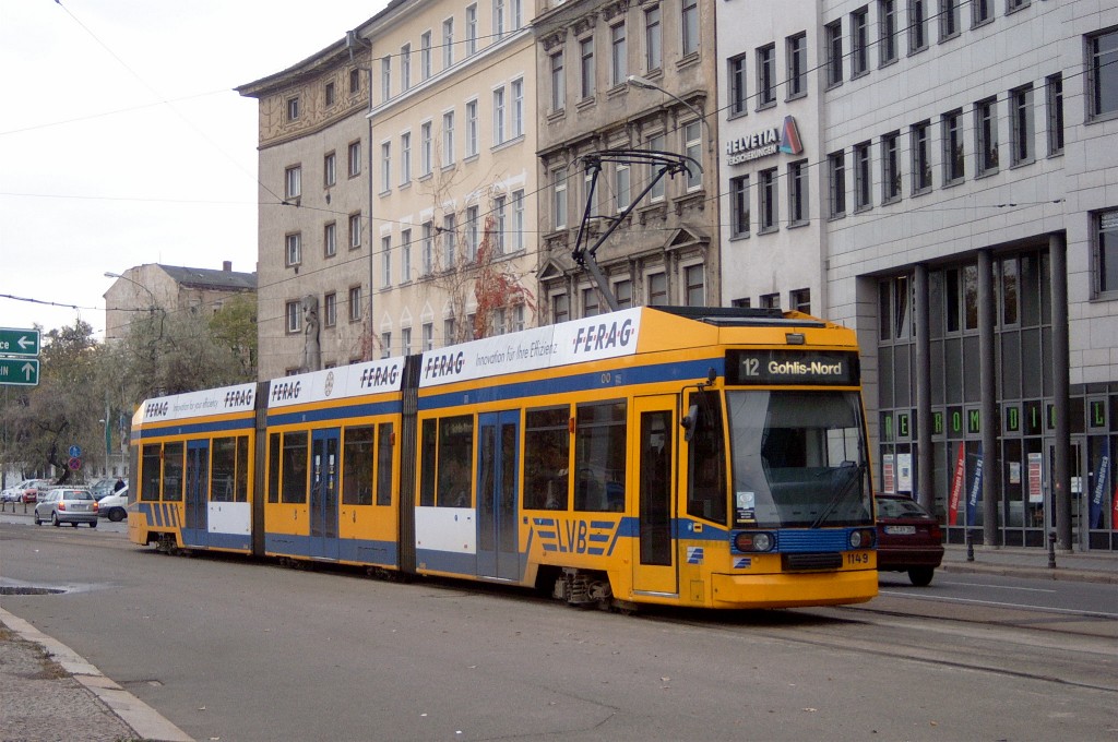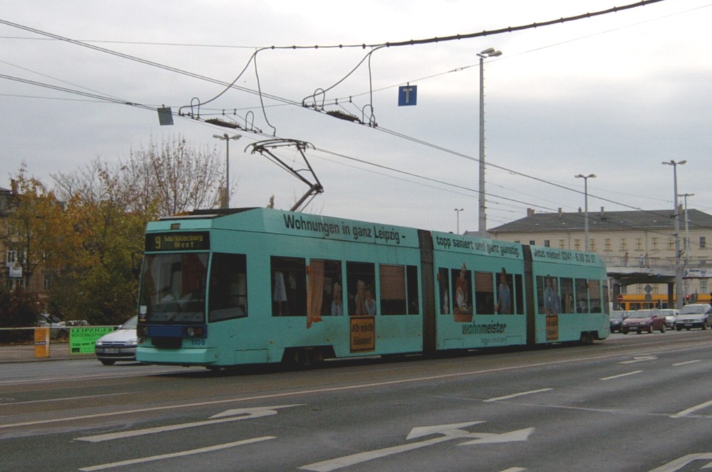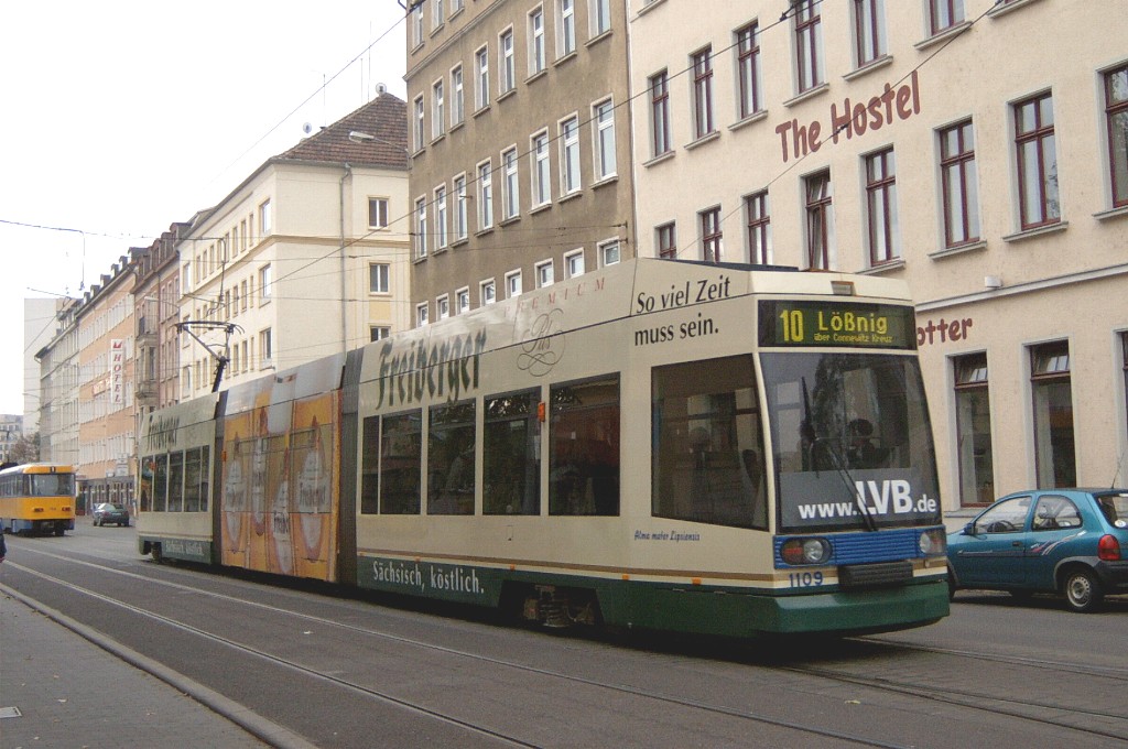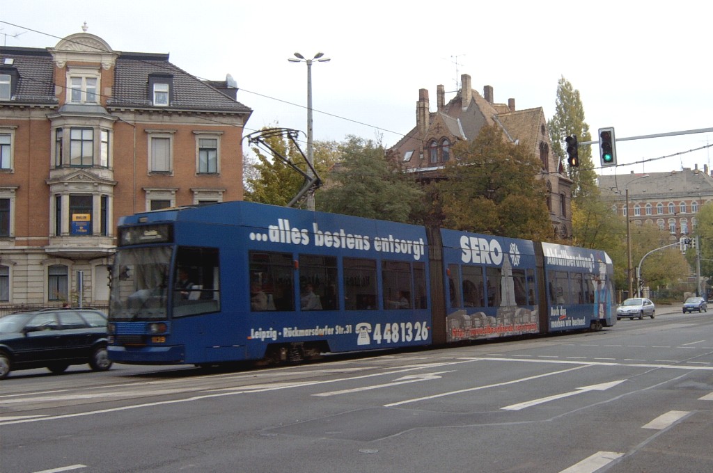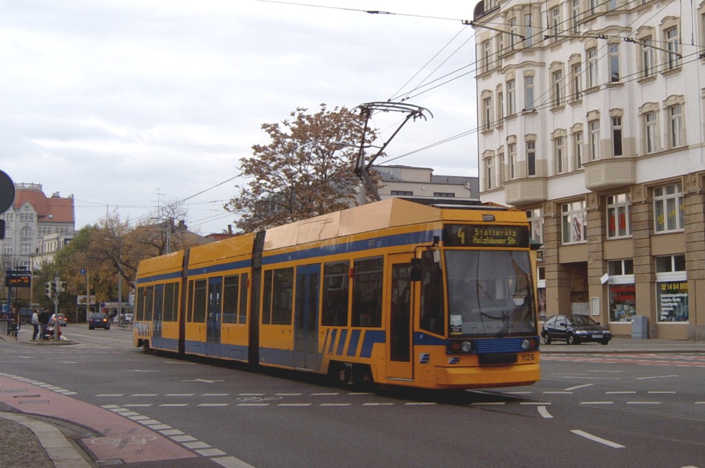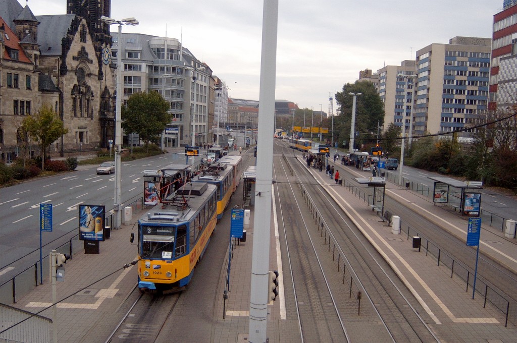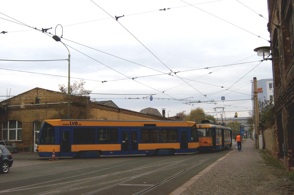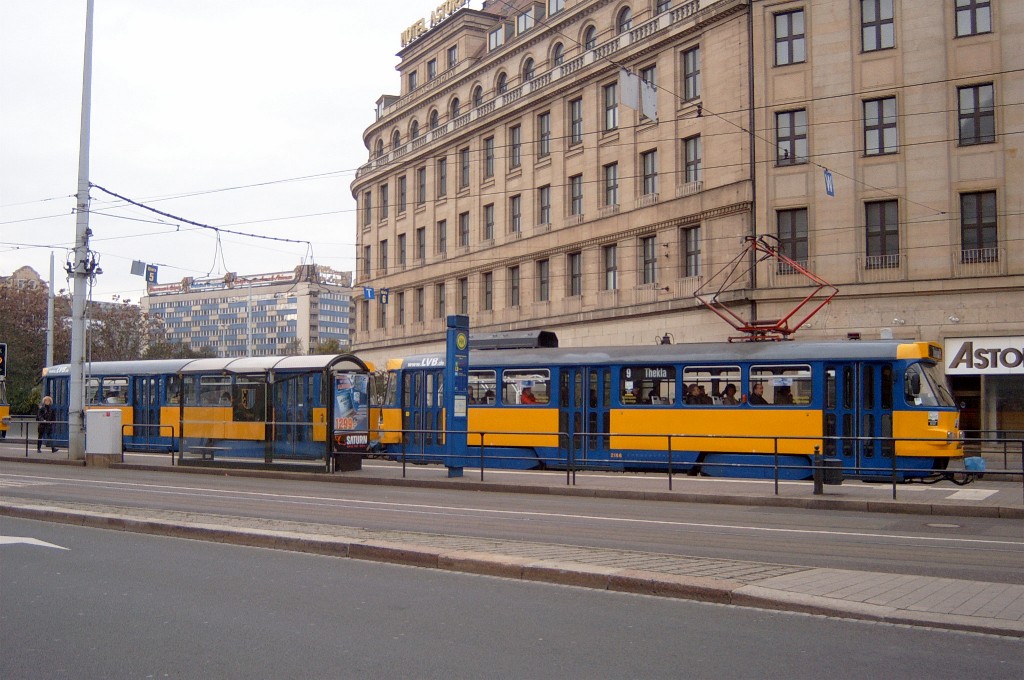 Am 29. Oktober 2003 machte ich eine Fototour durch Leipzig, auch wenn das Wetter nicht gerade das idealste war. Der Wagenpark der LVB (Leipziger Verkehrsbetriebe) umfasst Fahrzeuge der Typen T6A2/B6A2, T4D/B4D, T4D-M/B4D-M, NB4 und NGT8 sowie einige Sonder- und Arbeitsfahrzeuge. Die NGT8 tragen alle einen Namen. (November 2003)