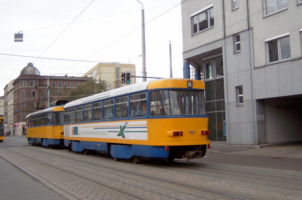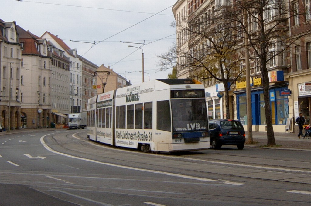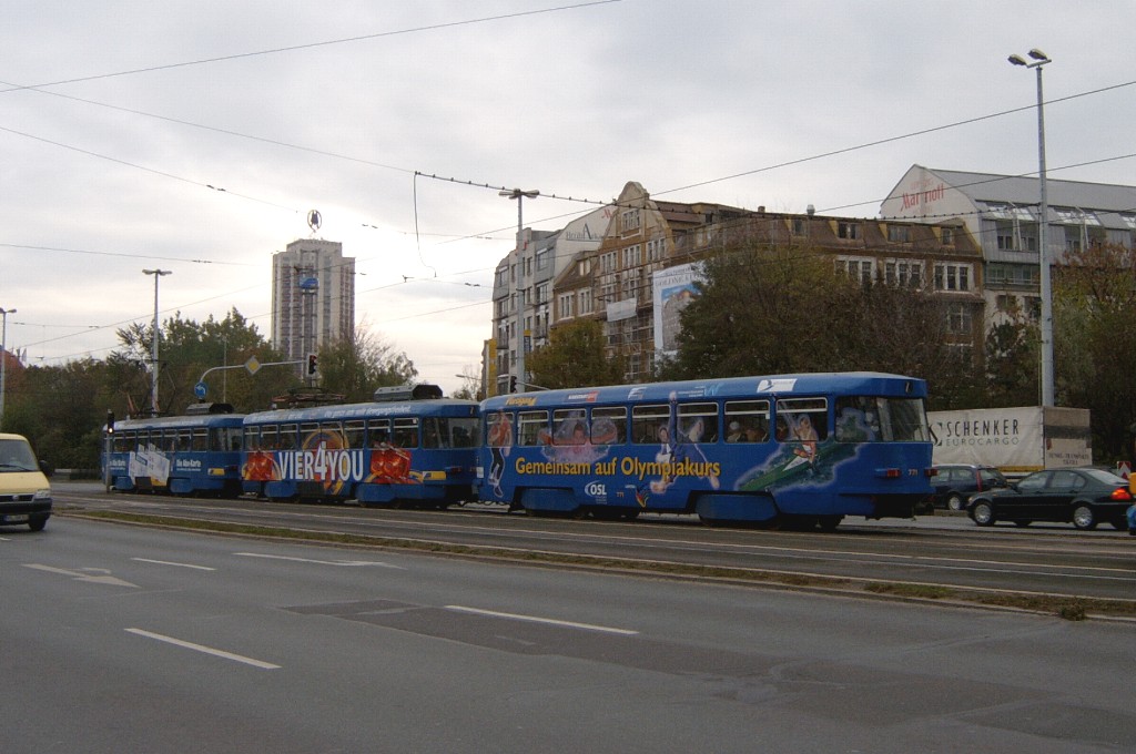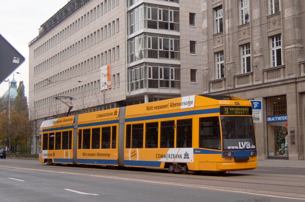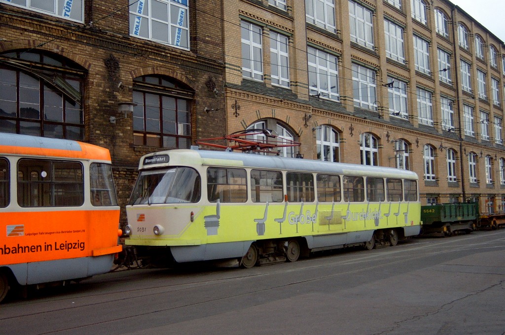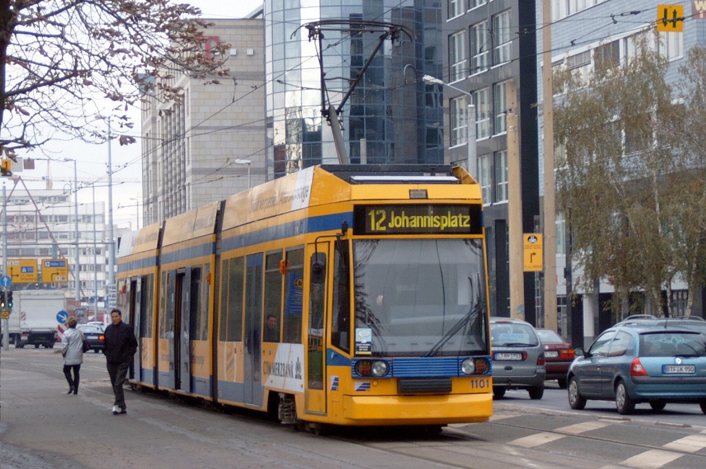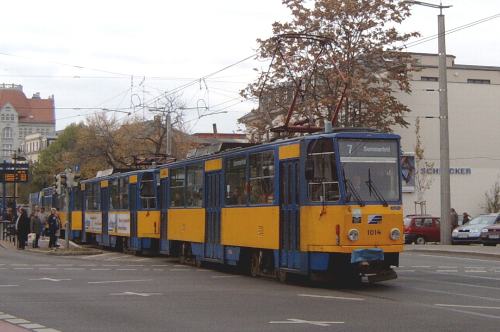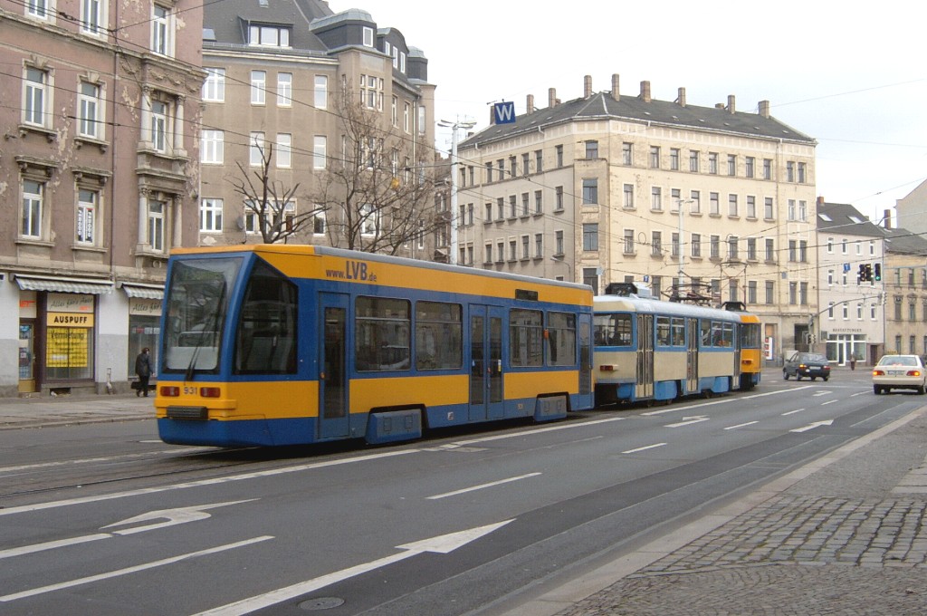 Am 29. Oktober 2003 machte ich eine Fototour durch Leipzig, auch wenn das Wetter nicht gerade das idealste war. Der Wagenpark der LVB (Leipziger Verkehrsbetriebe) umfasst Fahrzeuge der Typen T6A2/B6A2, T4D/B4D, T4D-M/B4D-M, NB4 und NGT8 sowie einige Sonder- und Arbeitsfahrzeuge. Die NGT8 tragen alle einen Namen. (November 2003)