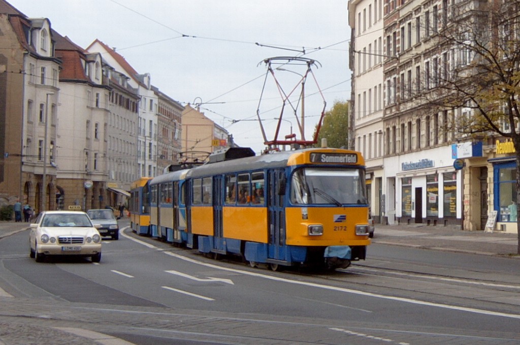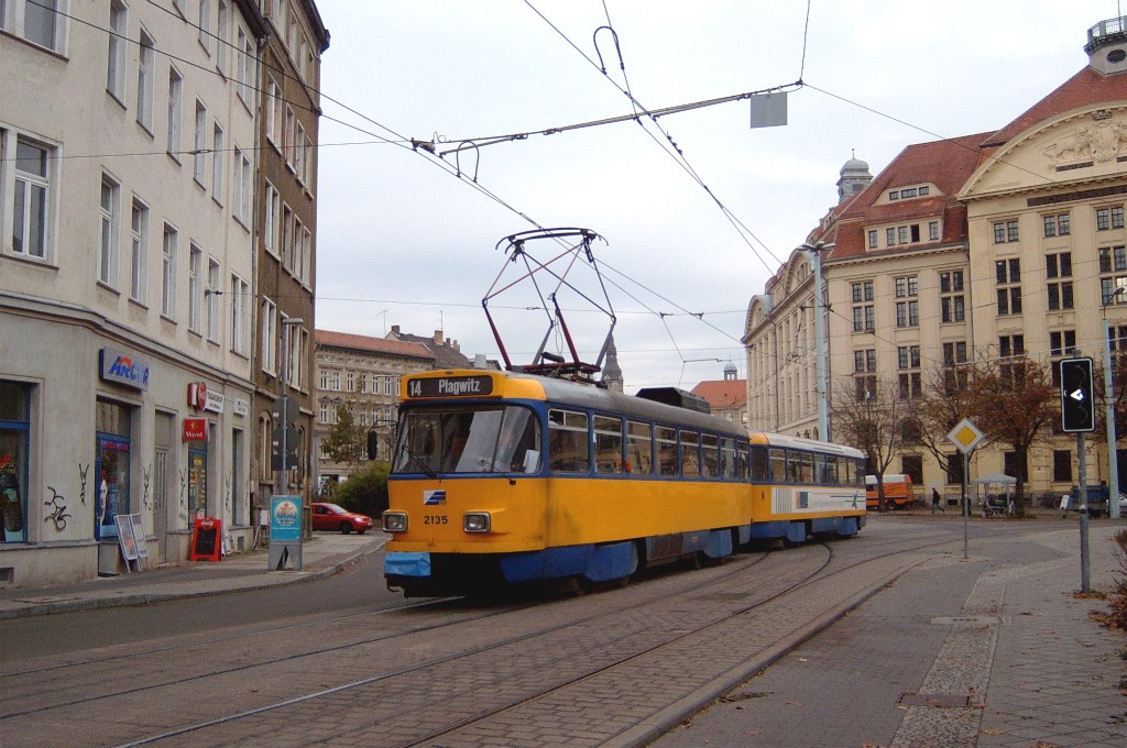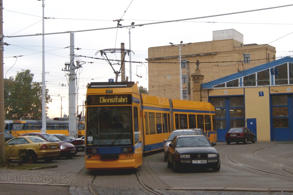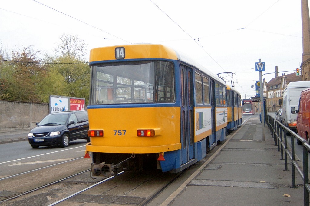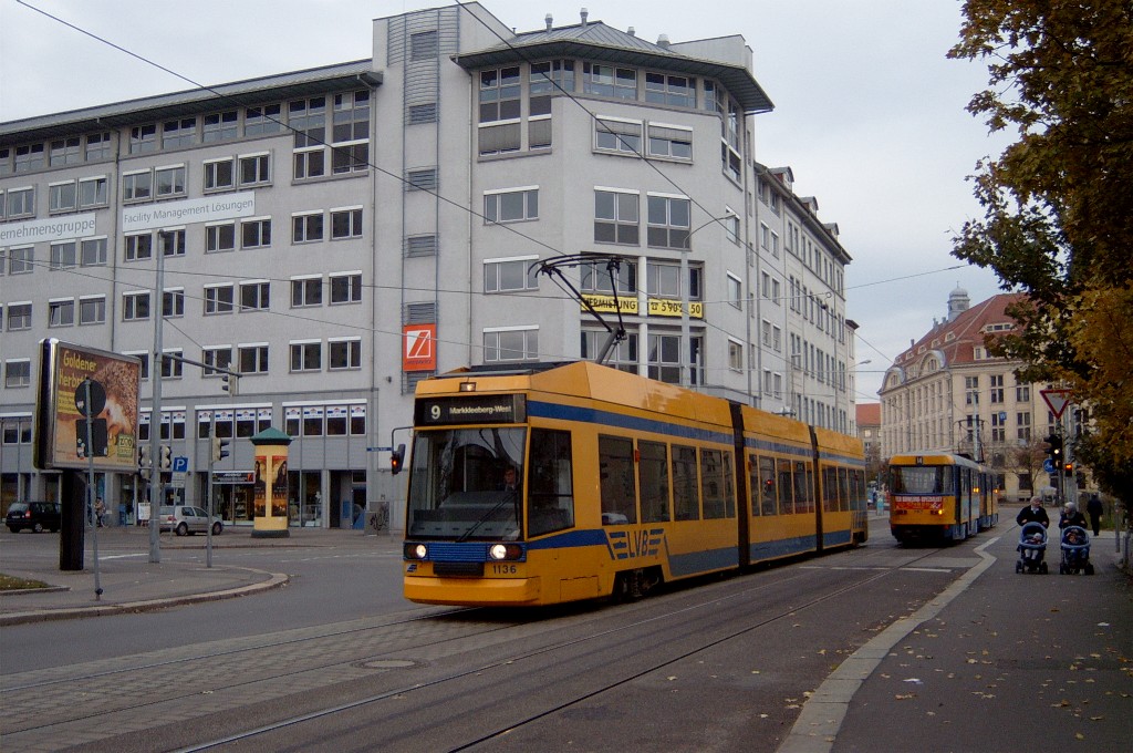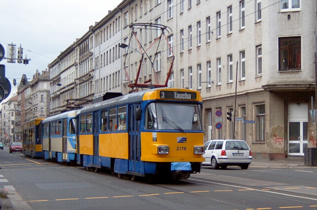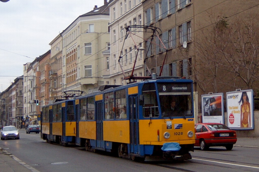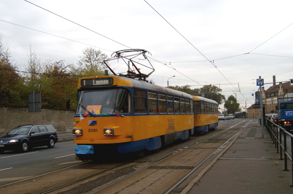 Am 29. Oktober 2003 machte ich eine Fototour durch Leipzig, auch wenn das Wetter nicht gerade das idealste war. Der Wagenpark der LVB (Leipziger Verkehrsbetriebe) umfasst Fahrzeuge der Typen T6A2/B6A2, T4D/B4D, T4D-M/B4D-M, NB4 und NGT8 sowie einige Sonder- und Arbeitsfahrzeuge. Die NGT8 tragen alle einen Namen. (November 2003)