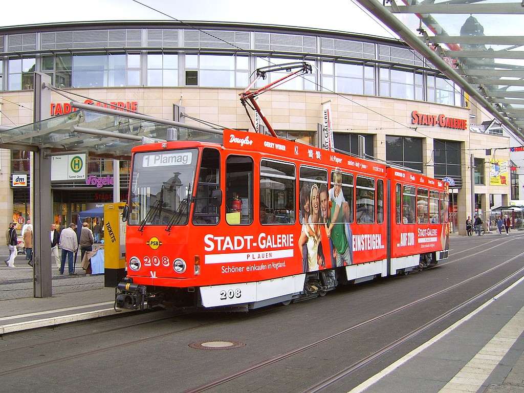 Tw 208 am Tunnel vor dem Gebäude, für das er wirbt - 01.09.2007. |