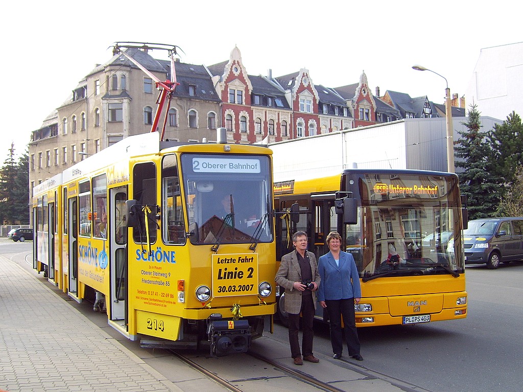 29.03.2007 | Morgen (30.03.) verkehrt die Straßenbahnlinie 2 letztmalig. Um 17:20 Uhr wird der letzte Linienwagen die Endhaltestelle Unterer Bahnhof verlassen. Der Traditionsverein der Plauener Straßenbahn e.V. und die PSB beabsichtigen, diesem Ereignis einen entsprechenden Rahmen zu geben. Auch ist eine Über- raschung geplant. Am Montag (02.04.) wird dann um 11:00 Uhr das neue Stadtbusliniennetz offiziell eingeweiht. An diesem Tag können die Busse kostenlos genutzt werden. Die Fahrpläne für die Bus- linien (A, B, C und D) und der neue Liniennetzplan sind auf der Homepage der PSB zu finden. | |