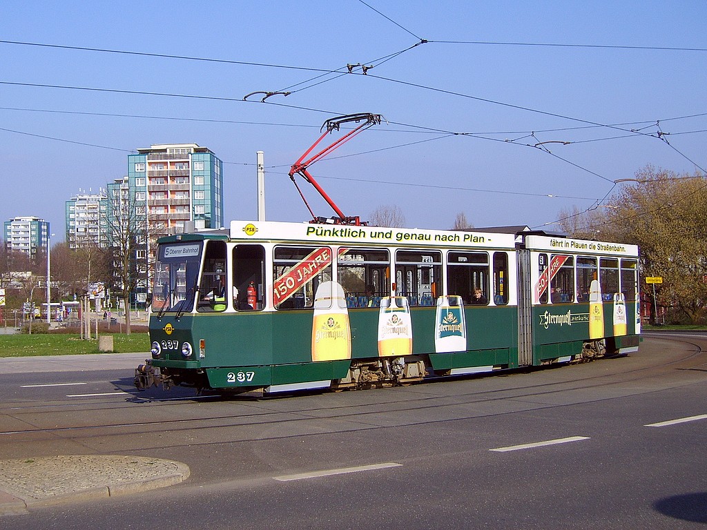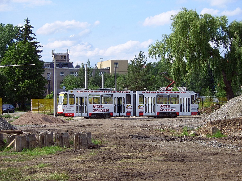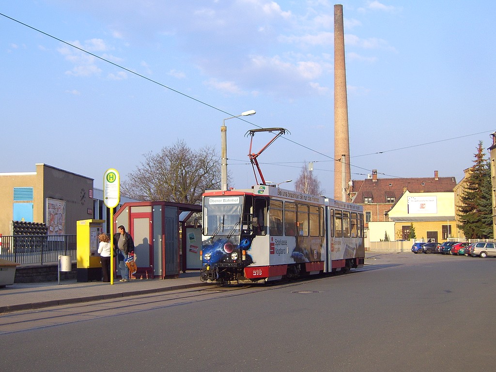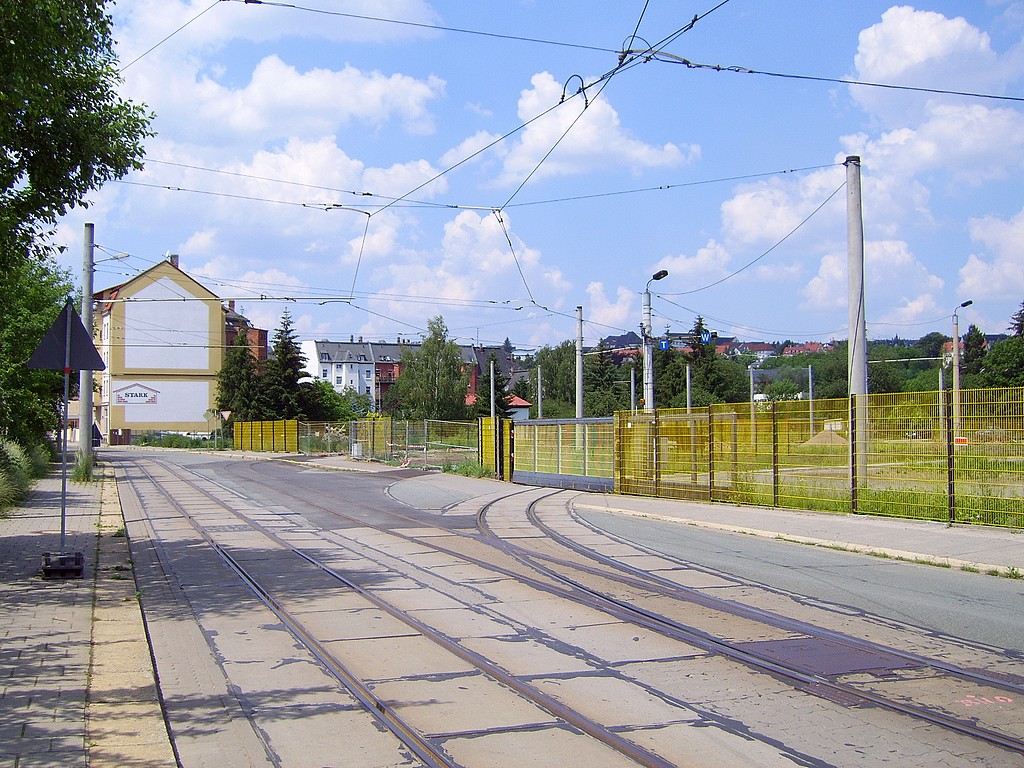 Am Freitagnachmittag (11.05.) war der Straßenbahnverkehr in die Südvorstadt aufgrund eines Verkehrsunfalls für ca. 30 min unterbrochen. Die Wagen der Linie 5 wurden in dieser Zeit nach Neundorf umgeleitet, da die sonst genutzte Wende- schleife am Unteren Bahnhof inzwischen nicht mehr befahrbar ist. Ende April wurde dort das Gleisstück zwischen Wiesen- und Holbeinstraße demontiert. |