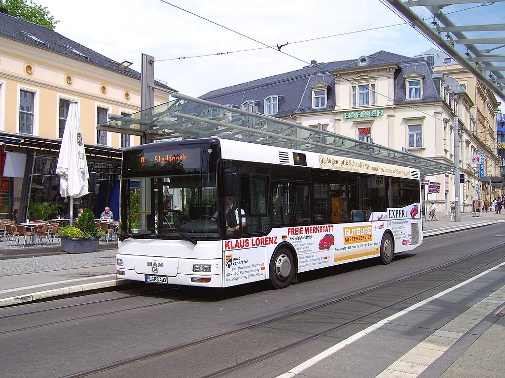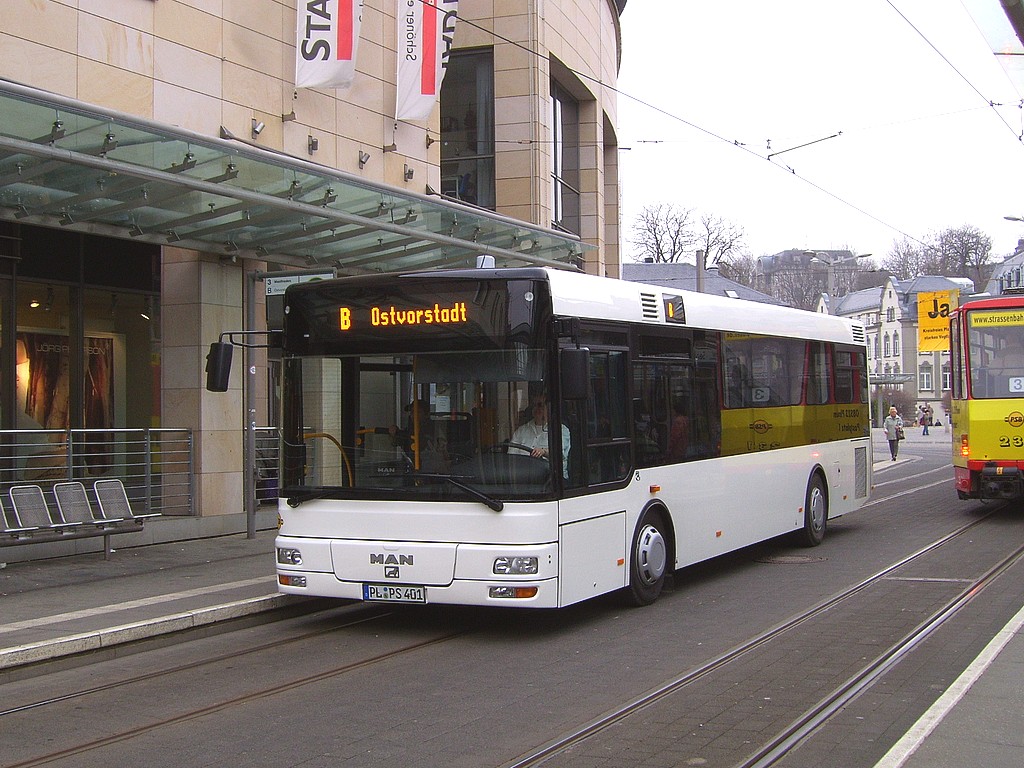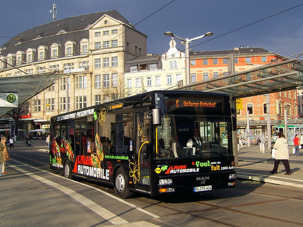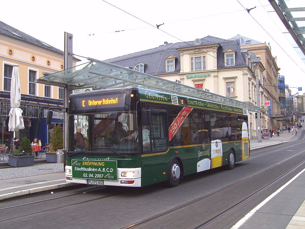 29.09.2007 | Am Dienstagabend (25.09.) wurden von 20:30 Uhr bis Betriebsschluss die Streckenabschnitte zur Pla- mag und ins Preißelpöhl im SEV, die Linie 5 mit einem Linientaxi bedient. Der Schienenersatzverkehr war aufgrund von Gleisbauarbeiten auf der Bahnhofstraße zwischen Albertplatz und Capitol erforder- lich. Erstmalig kamen mit diesem SEV PSB-Stadtbusse im Schienenersatzverkehr zum Einsatz. Die Haltestellen Oberer Bahnhof/Pausaer Straße und Am Vogtlandstadion wurden wie derzeit immer vom SEV nicht bedient. | |