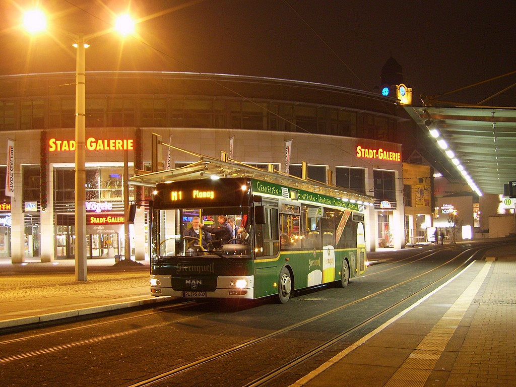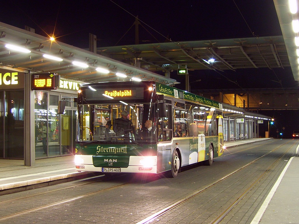 ![]() N1 (Tunnel - Oberer Bahnhof/Busbahnhof - Plamag), N3 (Tunnel - Reusa - Waldfrieden - Tunnel) und N5 (Tunnel - Ostvorstadt - Südvorstadt - Tunnel) sowie ab 21:00 Uhr auch die Linien N2 (Tunnel - Neundorf) und N4 (Tunnel - Preißelpöhl). Die Linien N1, N2 und N3 werden dabei von Stadtbussen bedient, die Linien N4 und N5 von Linientaxis. Vier Halte- stellen der Straßenbahnlinien werden während des Nachtverkehrs nicht angefahren, zwei nur in der Nacht bediente Haltestellen werden neu eingerichtet. Die genauen Linienführungen können dem neben- stehenden Plan der PSB entnommen werden. Die neuen Tages- sowie Nachtfahrpläne sind auf der Webseite der PSB zu finden. Mit dem Fahrplanwechsel wird außerdem die Haltestelle MediaMarkt in "Dürerstraße" um- benannt und die Haltestelle Forststraße durch das Einrichten einer neuen Richtungs- haltestelle an der Ecke Bahnhofstraße/Forststraße in beiden Fahrtrichtungen bedient. |