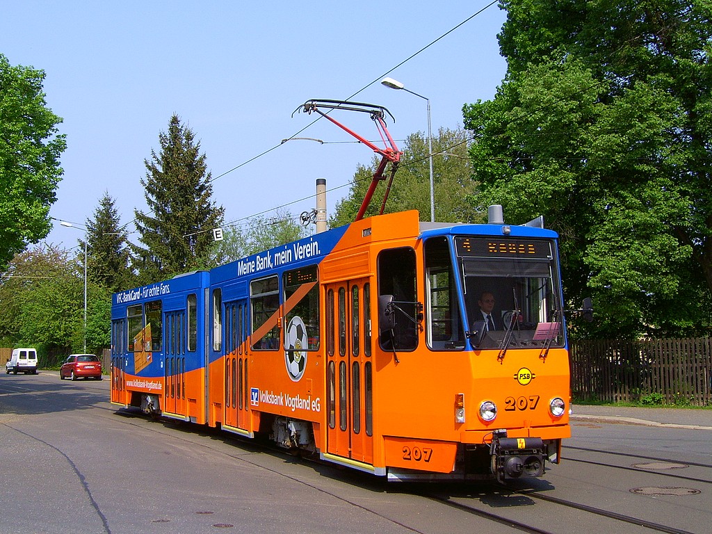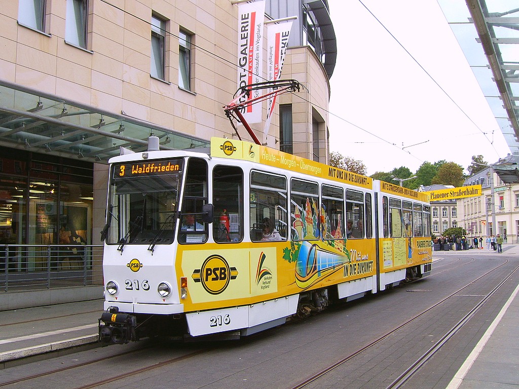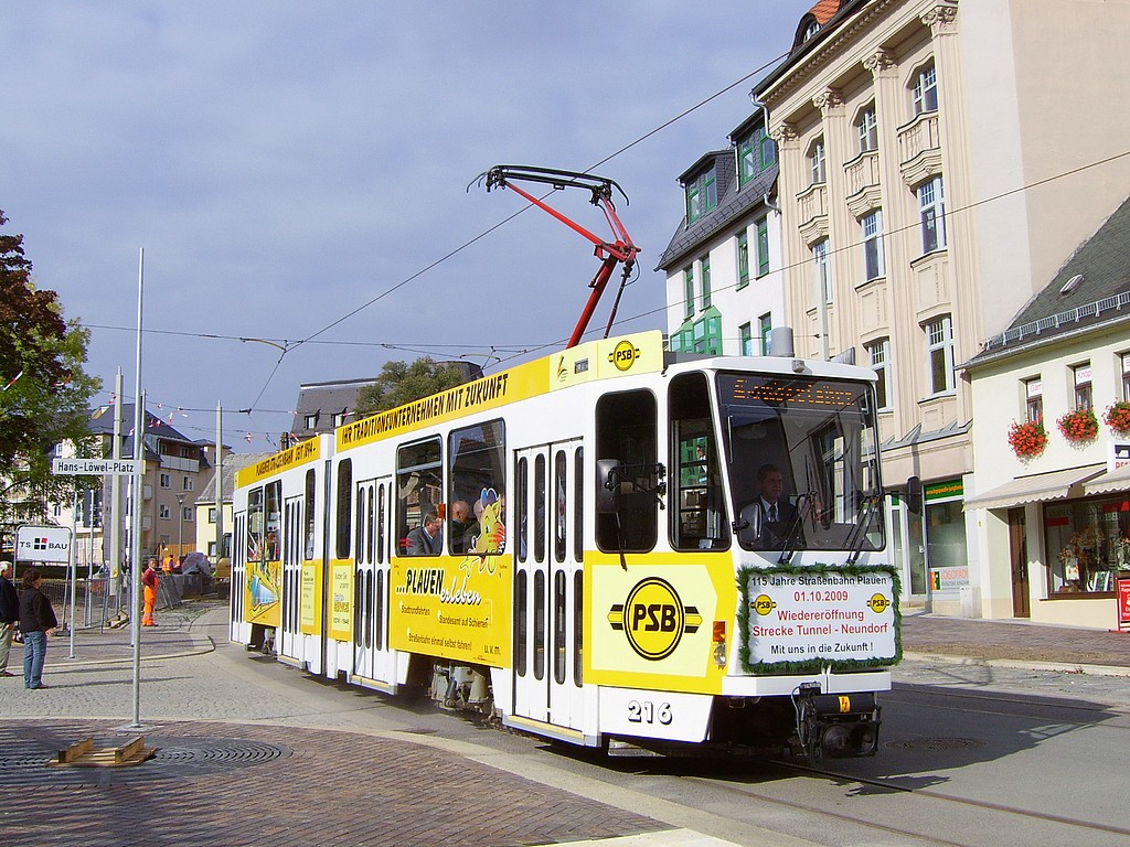 Seit Donnerstag letzter Woche (01.10.) ist Tw 216 mit der neuen PSB-Werbung „Plauener Straßenbahn - Mit uns in die Zukunft“ im Einsatz. |