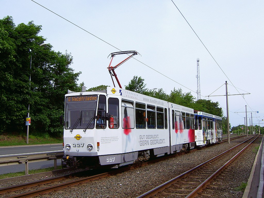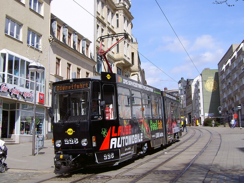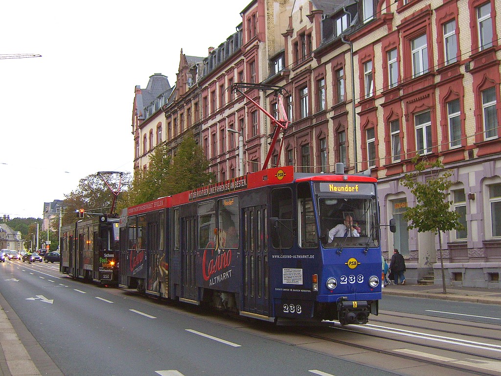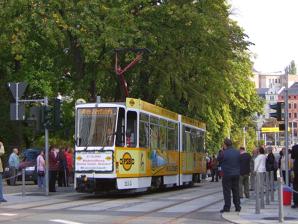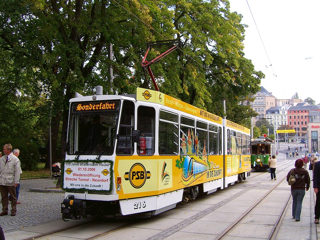 Ab kommenden Donnerstag (01.10.) verkehren wieder Straßenbahnen in Richtung Neundorf. Als besonderes Angebot gilt an diesem Tag auf allen Straßenbahnlinien der Tarif „2 auf 1“. Das heißt, dass jeweils 2 Fahrgäste mit einem Einzelfahrschein fahren dürfen. Tw 216 (neu mit PSB-Eigenwer- bung) kann an diesem Tag zwischen Tunnel und Endhaltestelle Neundorf sogar ganz ohne Fahrschein genutzt werden. Er wird zuvor auch als erste Straßenbahn wieder die Strecke befahren. |