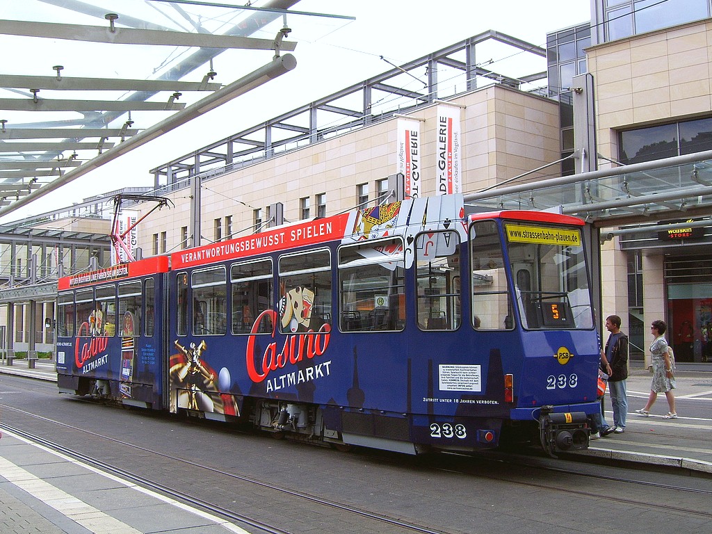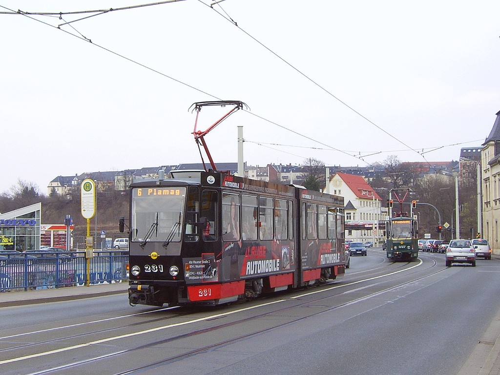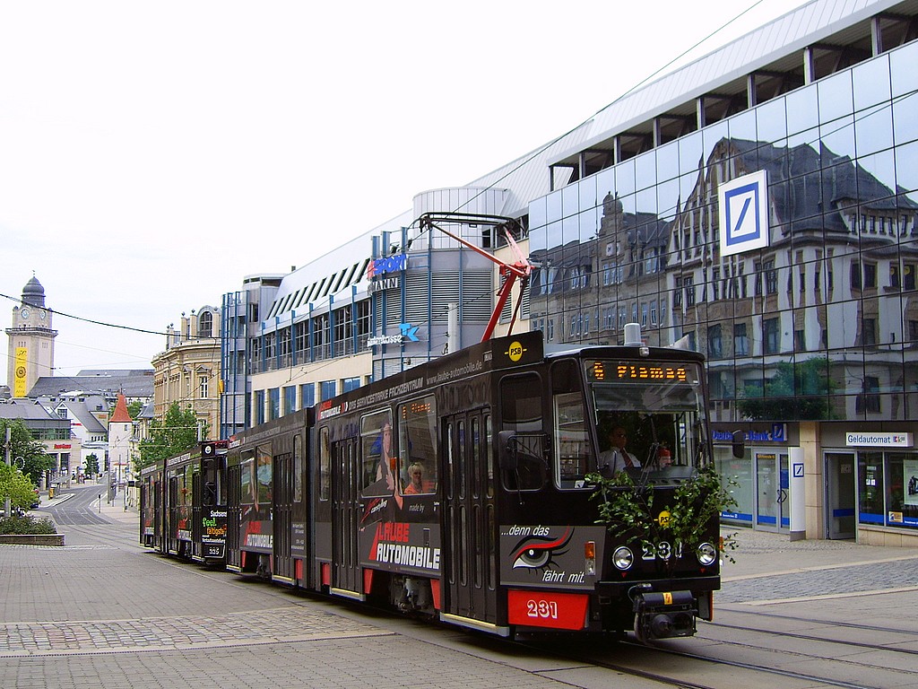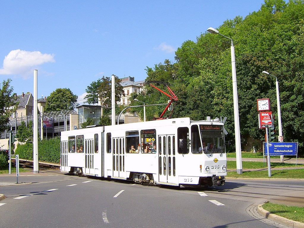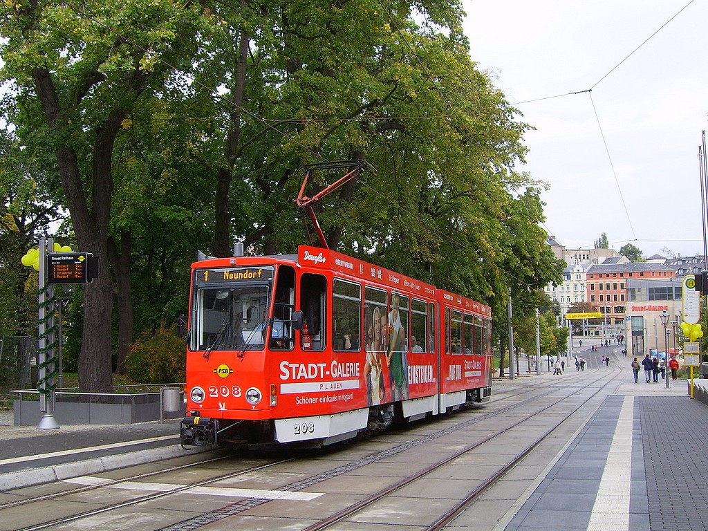 Ab kommenden Donnerstag (01.10.) verkehren wieder Straßenbahnen in Richtung Neundorf. Als besonderes Angebot gilt an diesem Tag auf allen Straßenbahnlinien der Tarif „2 auf 1“. Das heißt, dass jeweils 2 Fahrgäste mit einem Einzelfahrschein fahren dürfen. Tw 216 (neu mit PSB-Eigenwer- bung) kann an diesem Tag zwischen Tunnel und Endhaltestelle Neundorf sogar ganz ohne Fahrschein genutzt werden. Er wird zuvor auch als erste Straßenbahn wieder die Strecke befahren. |