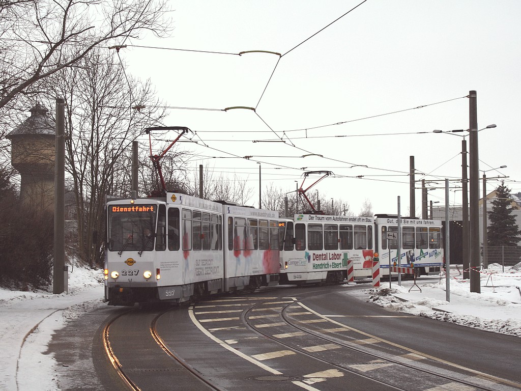 Die beiden Erstgenannten fuhren vom Betriebshof über die Endhaltestelle Plamag nach Waldfrieden, wo sie für etwa 2 ½ Stunden abgestellt wurden. Die dritte Doppeltraktion fuhr hingegen über die Endhaltestelle Preißelpöhl nach Reusa und wurde im dortigen Stumpfgleis abgestellt. Nach dem Ende der Ver- anstaltung standen die Bahnen am Vogtlandklinikum für die Rückfahrt bereit. |