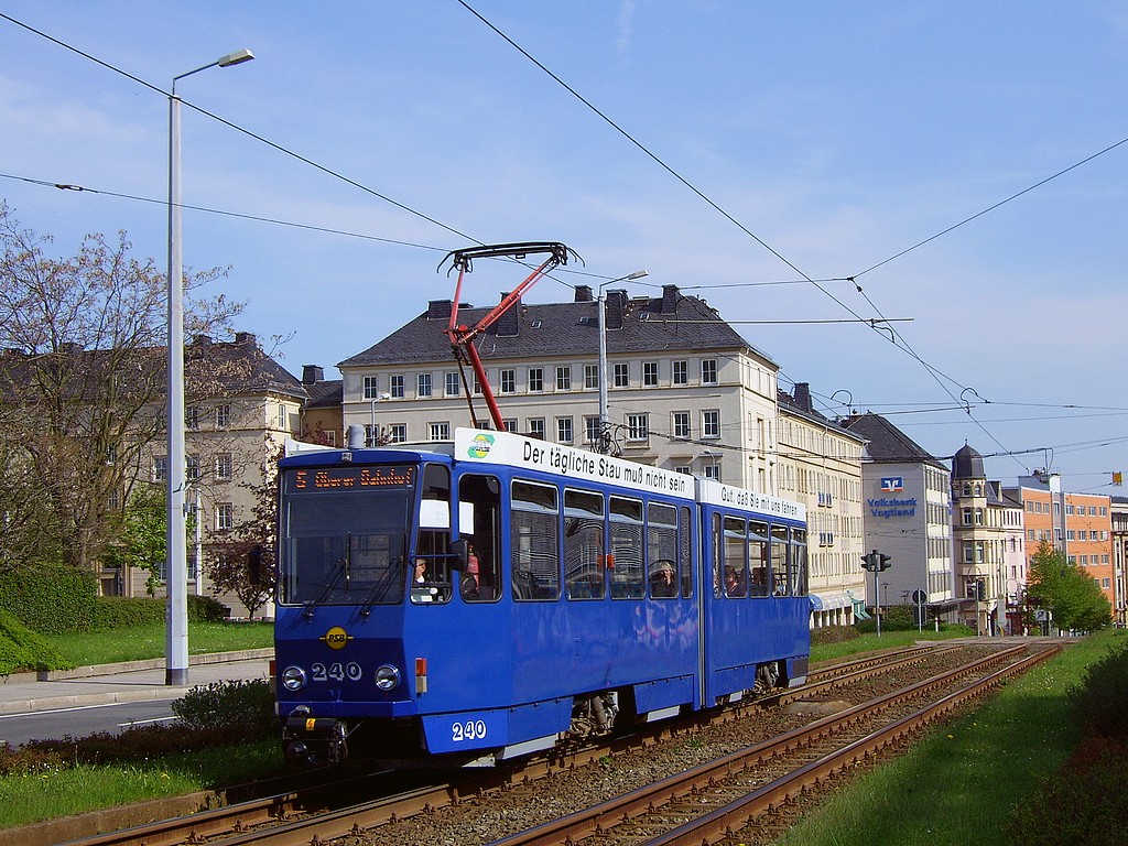 Am Donnerstagnachmittag in der zweiten Juni-Woche (11.06.) wurde eine 64-jährige Frau beim Zu- sammenstoß mit einer Straßenbahn der Linie 6 auf der Bahnhofstraße schwer verletzt. In Höhe Post- platz war die Frau gegen 15:20 Uhr ohne auf die Bahn zu achten in den Gleisbereich getreten, der Fahrer bemerkte die Frau zu spät. Die 64-Jährige musste stationär im Vogtlandklinikum aufgenom- men werden. Durch den Unfall kam es auf allen Straßenbahnlinien bis nach 16:30 Uhr zu Fahrtaus- fällen und Verspätungen. |