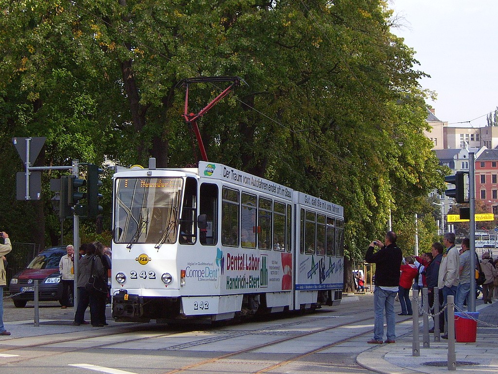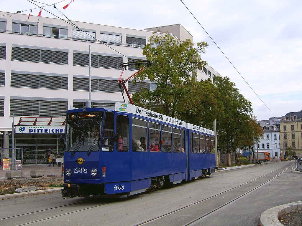 Tw 240 trägt seit dieser Woche auf der linken Fahrzeugseite, B-Teil, wieder Werbung (IKK Sachsen). |