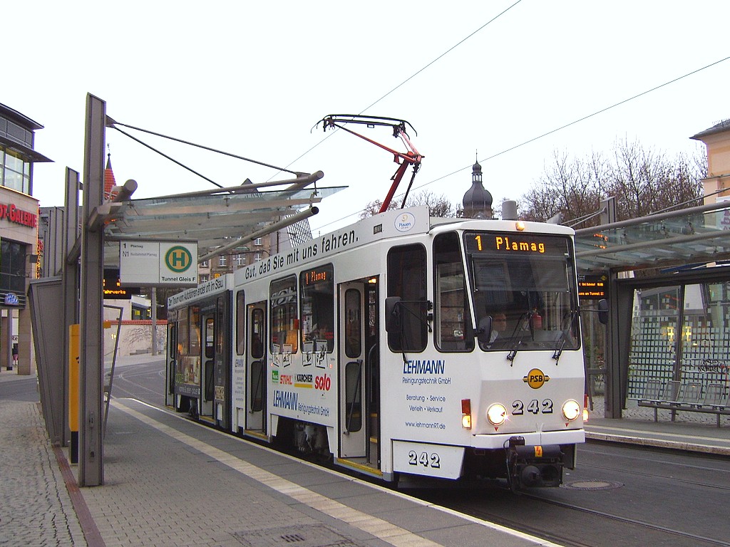 Zum Faschingsdienstag (24.02.) setzte die PSB wie schon im vergangenen Jahr drei Doppeltraktionen zusätzlich zum normalen Linienverkehr ein, um das durch zahlreiche Schulklassen, die eine Veranstaltung in der Festhalle besuchten, stark erhöhte Fahrgastaufkommen am Vormittag bzw. Mittag bewältigen zu können. Im Einsatz waren Tw 227 + Tw 242, Tw 244 + Tw 245 und Tw 233 + Tw 240. |