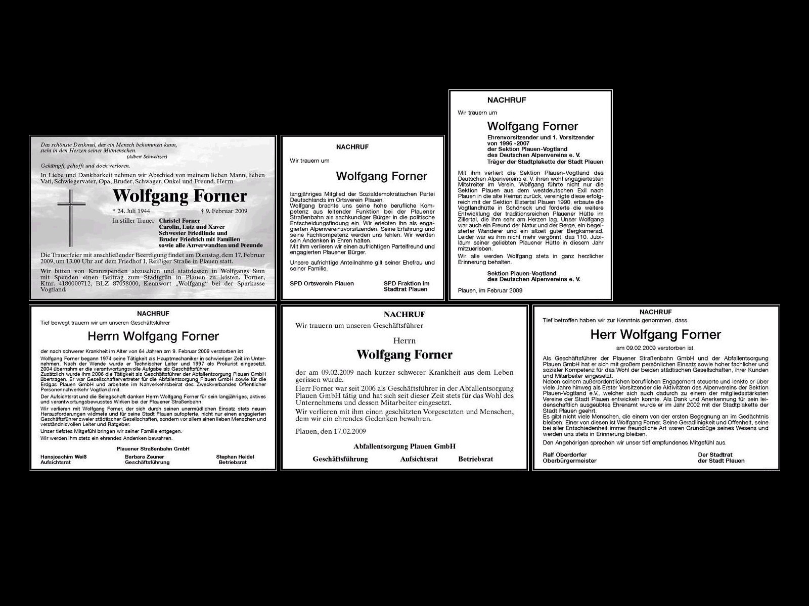 22.02.2009 | Wolfgang Forner, der eigentlich noch bis 31.07.2009 erster Geschäftsführer der Plauener Straßenbahn GmbH (PSB) gewesen wäre, ist Anfang Februar im Alter von 64 Jahren noch kurzer schwerer Krankheit verstorben. Er erlag einem Gehirn- tumor. Seit 1974 arbeitete er bei der PSB, erst als Hauptmechaniker, ab 1990 als Technischer Leiter. 1997 wurde er Prokurist, 2004 dann Geschäftsführer. Zwei Jahre später wurde ihm zusätzlich die Tätigkeit als Geschäftsführer der Abfallent- sorgung Plauen GmbH (AEP) übertragen. Als PSB-Chef arbeitete er außerdem im Nahverkehrsbeirat des ZVV mit. Von 1996 bis 2007 war Forner des Weiteren Erster Vorsitzender der Sektion Plauen-Vogtland des Deutschen Alpenvereins. | |