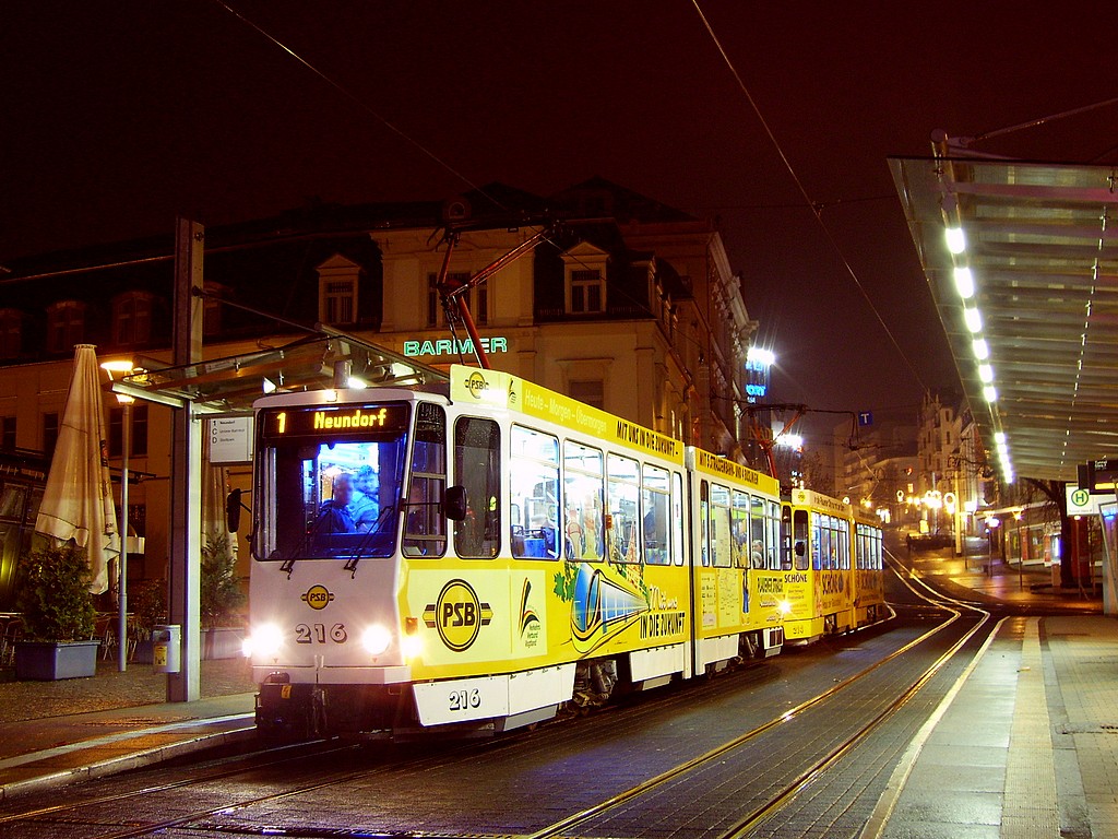 10.10.2010 | Am 10.10. verkehrten zum verkaufsoffenen Sonntag die Straßenbahnen und Stadtbusse nach dem Samstags-Fahrplan. Tagsüber fuhren die Bahnen damit statt aller 20 Minuten alle 15 Minuten. Der letzte Anschluss aller Nachtbuslinien am Tunnel bestand wie sonntags üblich um 23:00 Uhr. | |