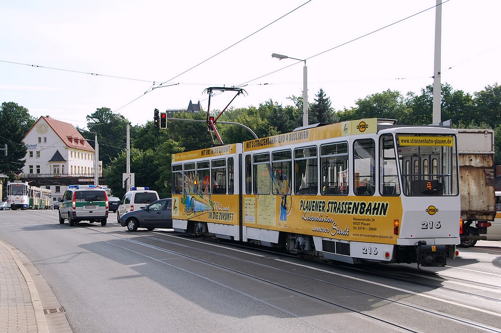 19.09.2010 | Am Montagmorgen (13.09.) war der Straßenbahnverkehr zur Plamag ab 05:40 Uhr für etwa eine Stunde unterbrochen. Auf der Kreuzung Pausaer Straße/Martin-Luther-Straße waren zwei Pkws zusammengestoßen. Ein 56-jähriger Autofahrer wollte die Kreuzung stadteinwärts bei roter Ampel überqueren. Dabei stieß er jedoch mit einem von rechts kommendem Opel zusammen. Beide Fahrzeuge waren nach dem Unfall nicht mehr fahrbereit. | |