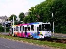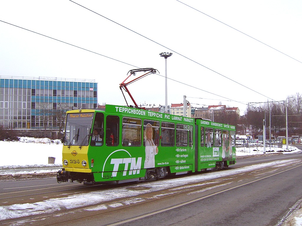 Seit der 3. Kalenderwoche ist Tw 224 mit neuer Werbung im Einsatz. Auf der türlosen Seite wirbt nun der Tapeten-/Teppichboden-Markt TTM, für den zuvor fast 17 Jahre lang Tw 226 geworben hatte. Die Türenseite sowie Front und Heck von Tw 224 verblieben in der bisherigen gelben Lackierung. |