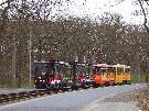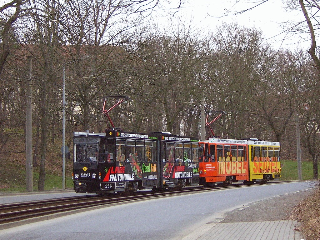 Am späten Dienstagnachmittag (20.04.) stießen auf der Kreuzung Straße der Deutschen Einheit/Bahn- hofstraße/August-Bebel-Straße ein Pkw und eine Straßenbahn der Linie 5 zusammen. Ein 67-jähriger BMW-Fahrer wollte bei, nach eigenen Aussagen, Gelb noch den Kreuzungsbereich passieren. Dort stieß er jedoch mit einer bereits von rechts aus Richtung Innenstadt kommenden Bahn (Tw 214) zusammen. Durch den Aufprall geriet der BMW auf die Gegenfahrbahn und stieß mit einem dort haltenden VW-Transporter zusammen, welcher wiederum noch gegen einen dahinter stehenden Opel geschoben wurde. Bei dem Unfall wurden der BMW-Fahrer sowie die beiden Insassen des VW leicht verletzt. Etwa eine Stunde lang kam es im Bereich der Unfallstelle zu starken Verkehrsbehinderungen. Die Straßenbahnlinien 1, 5 und 6 fuhren in der betroffenen Zeit nach Preißelpöhl. |
