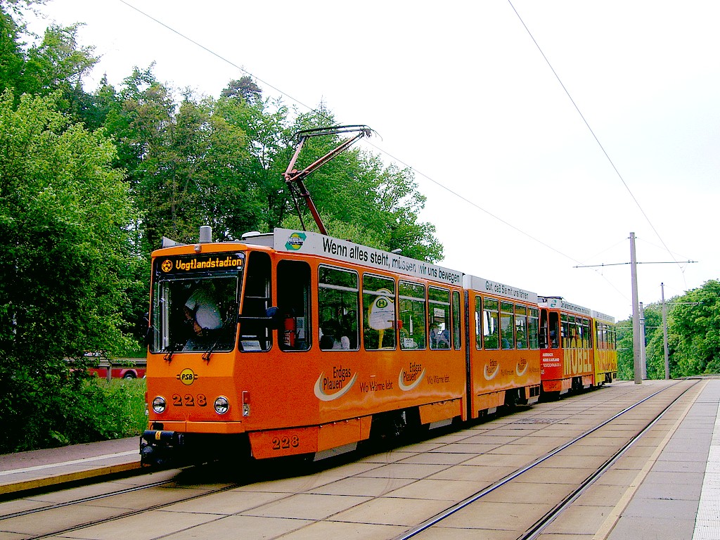Tw 228 + Tw 235 mit Ziel „[Fußball] Vogtlandstadion“/„[Fußball]