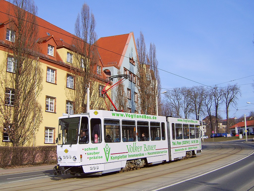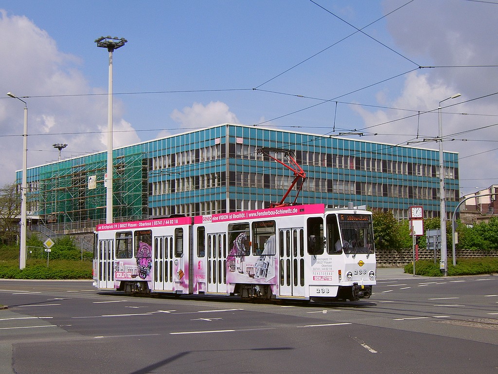 Seit Samstag (15.05.) ist Tw 238 mit neuer Werbung auf der Türenseite im Einsatz. Es wirbt Fensterbau Schlewitz aus dem Plauener Ortsteil Oberlosa. |