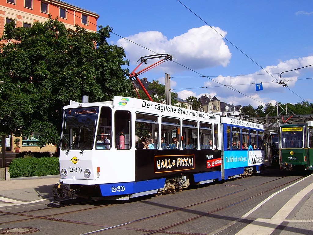 Tw 240 ist seit Ende Juli mit einer neuen Maler-Plauen-Werbung, der inzwischen fünften Werbungsversion des Unternehmens, im Einsatz. Vorn auf der linken Seite erhielt er neue Werbung für einen Pizzaservice. Damit sind nun nach langer Zeit wieder alle Außenflächen der Linienwagen mit Werbung versehen. |