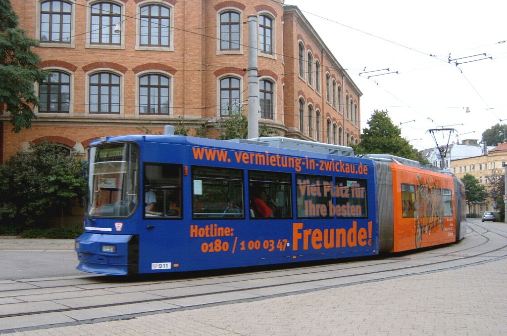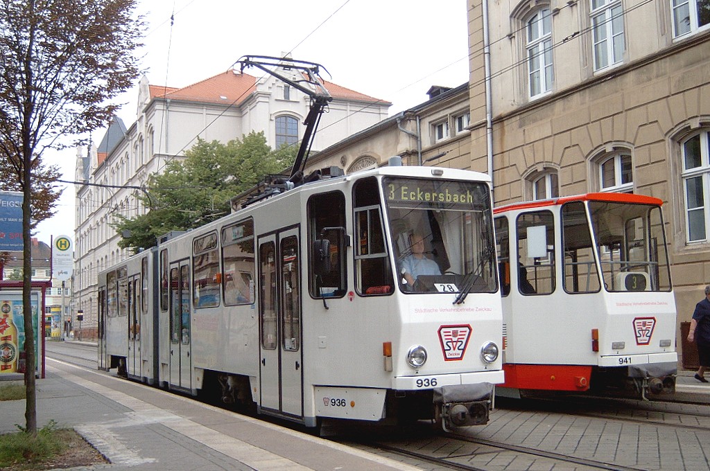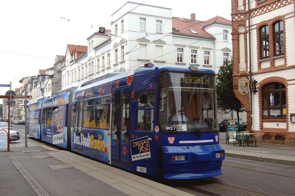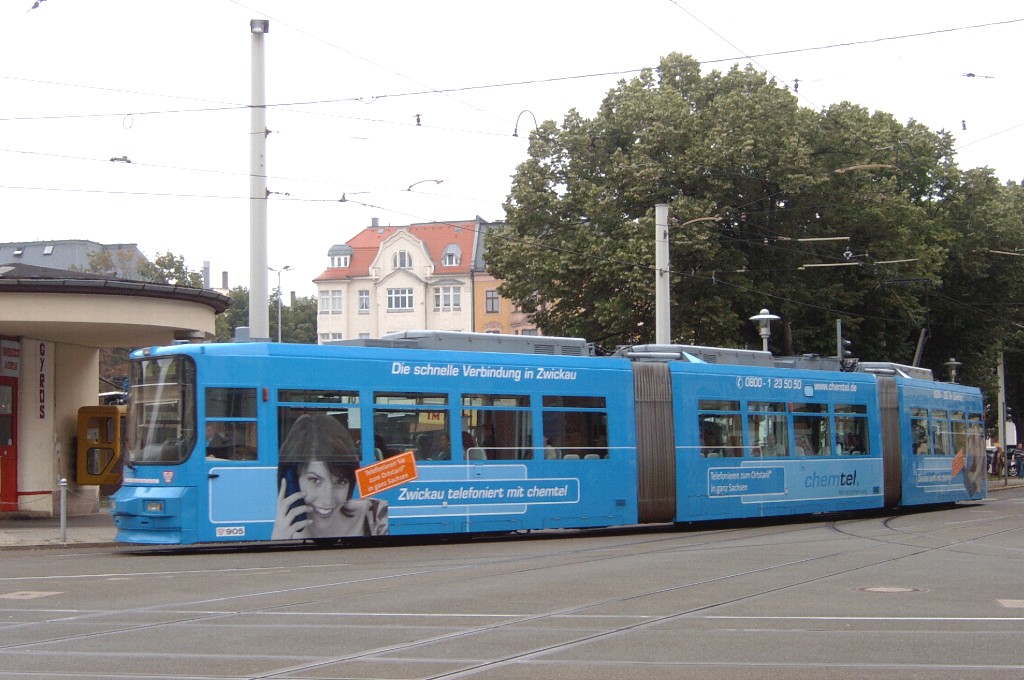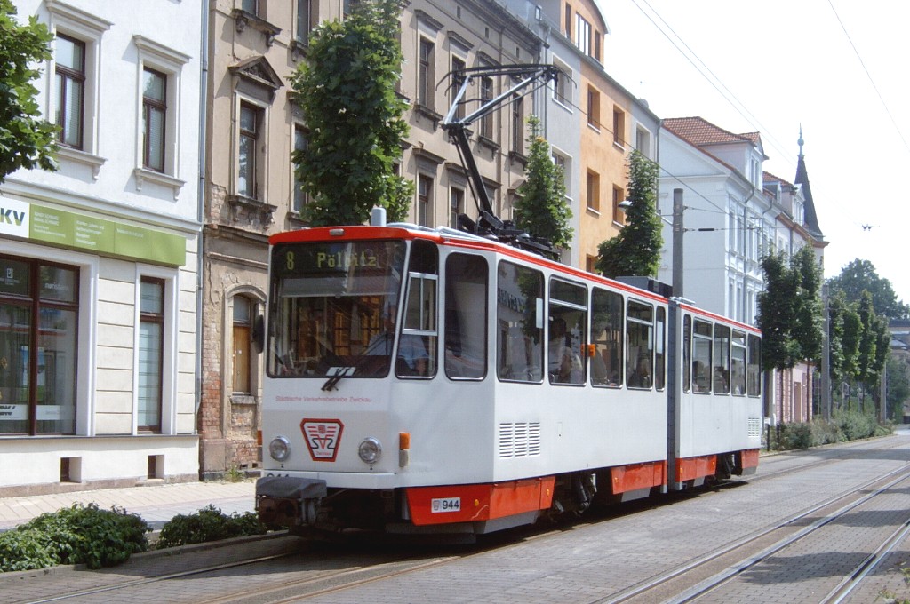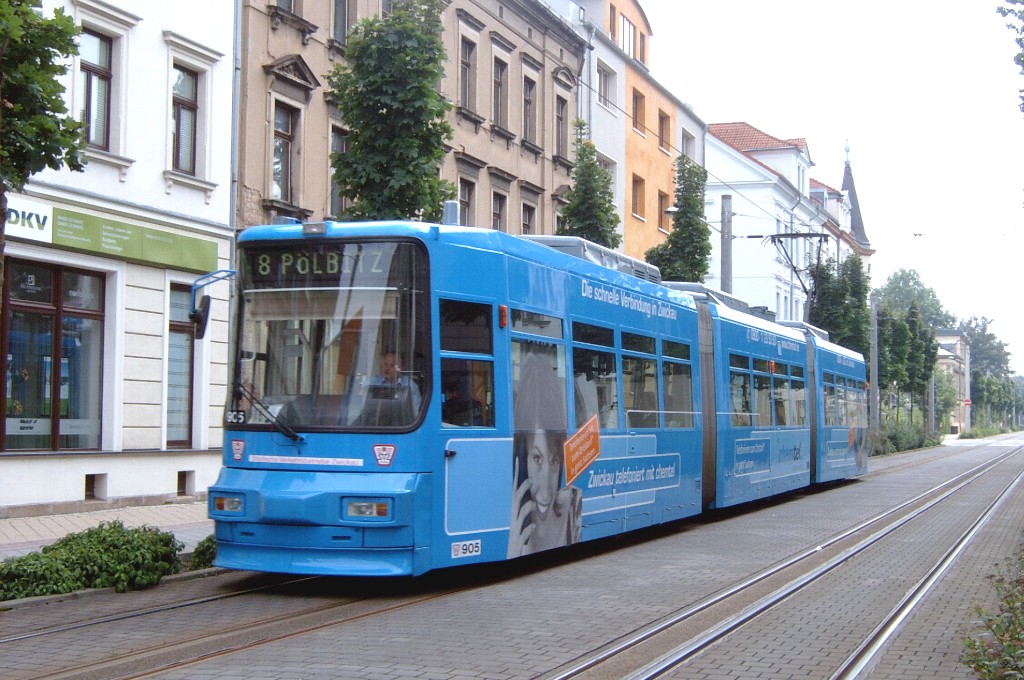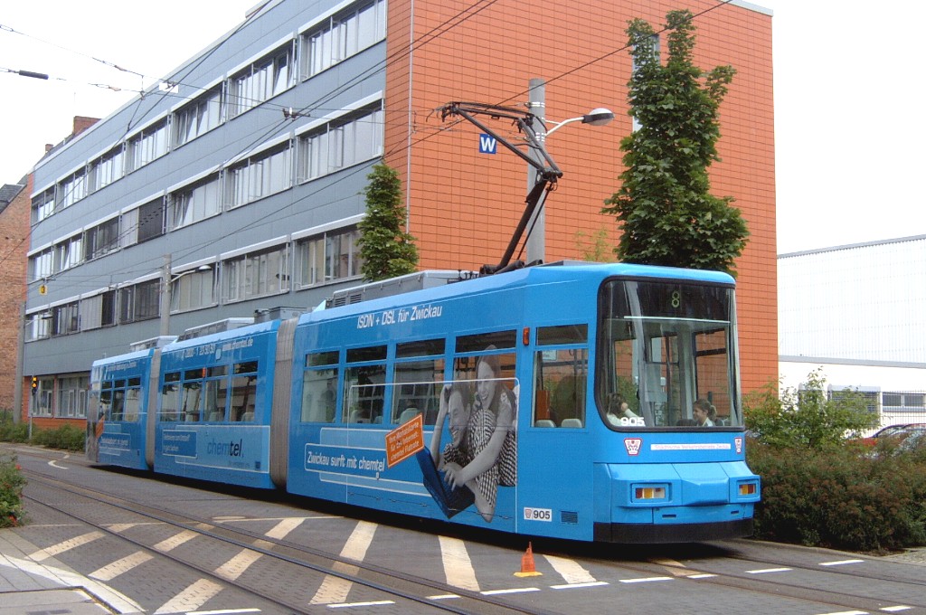Zwickau am 17.08.2005: Derzeit gibt es fünf Straßenbahnlinien (Linie 3: Stadthalle - Eckersbach, Linie 6: Städtisches Klinikum - Eckersbach, Linie 7: Hauptbahnhof - Pölbitz, Linie 8: Pölbitz - Stadthalle und die HVZ-Linie 1: Eckersbach - Hauptbahnhof). In den Ferien kommen nur Solo-KT4D-M und GT6M zum Einsatz.