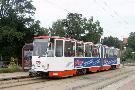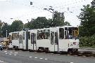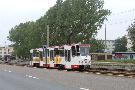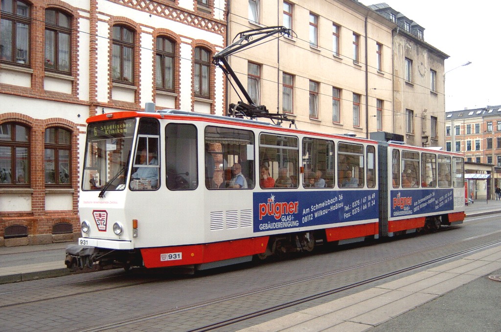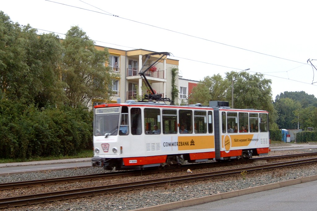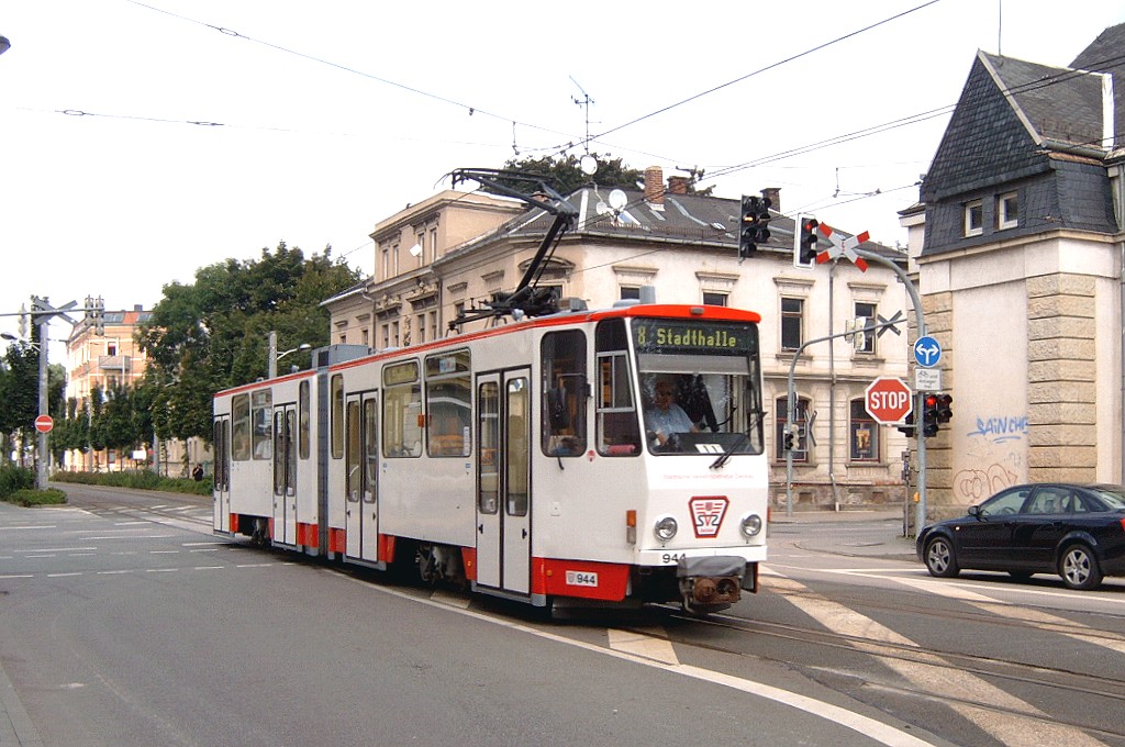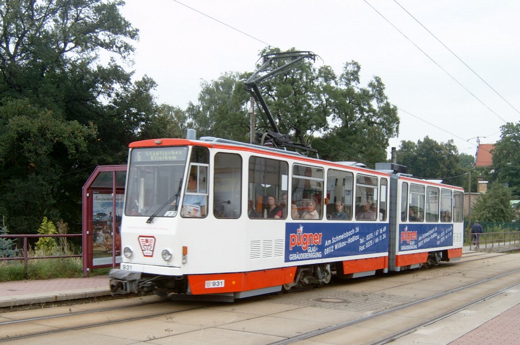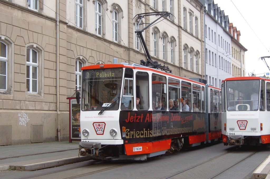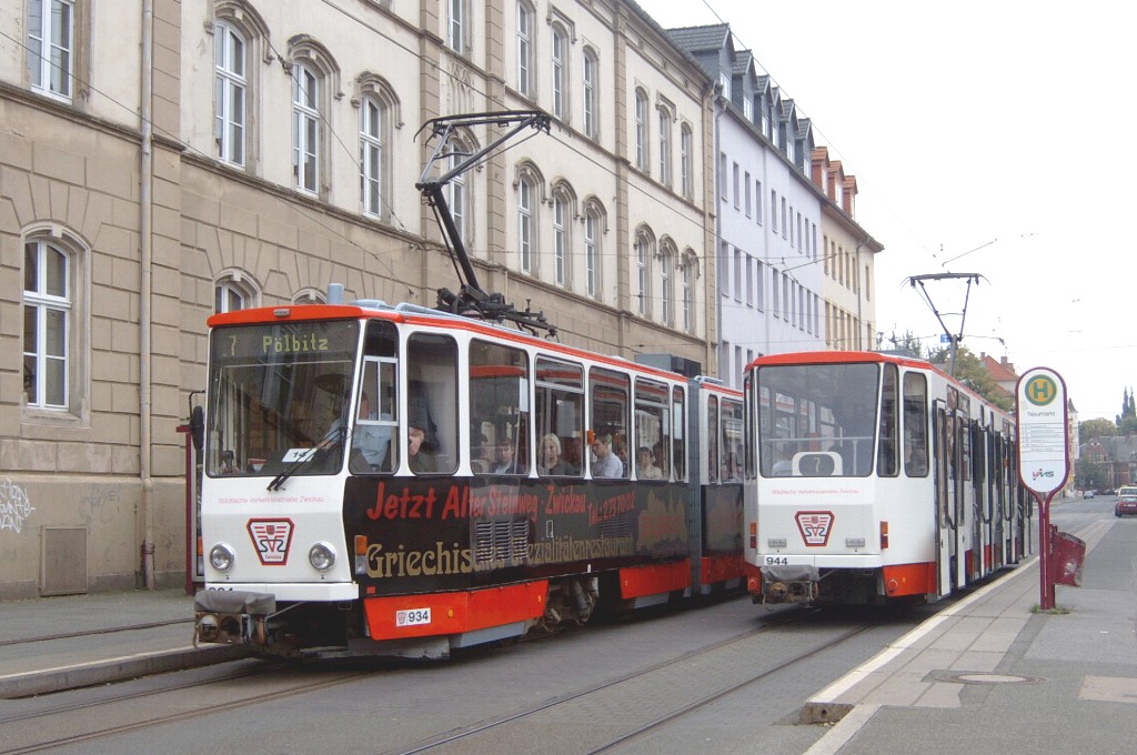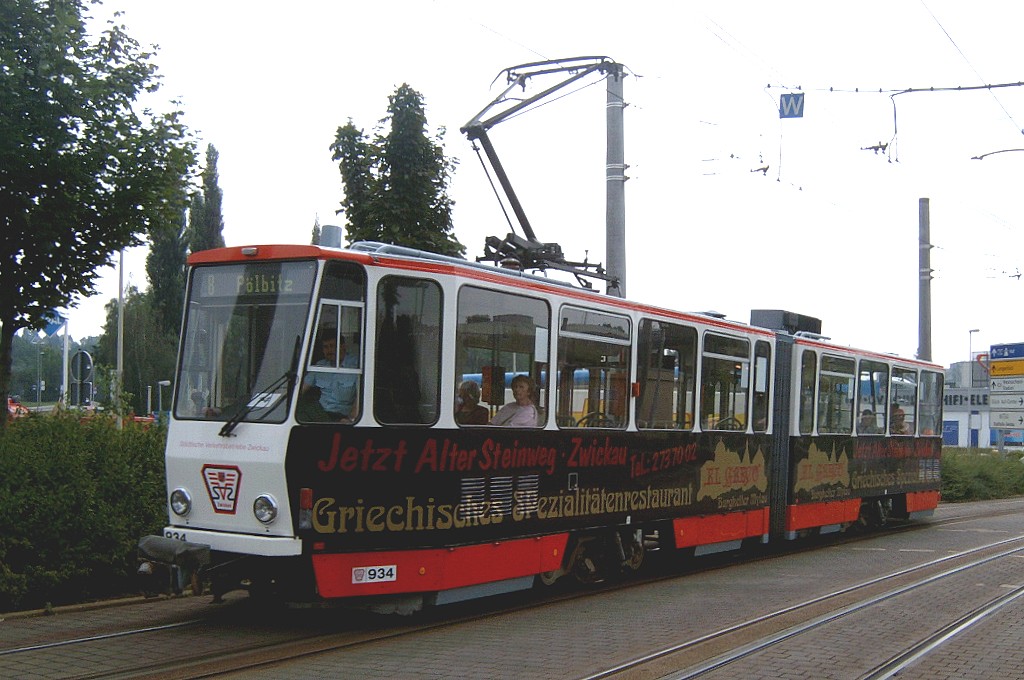 Zwickau am 17.08.2005: Derzeit gibt es fünf Straßenbahnlinien (Linie 3: Stadthalle - Eckersbach, Linie 6: Städtisches Klinikum - Eckersbach, Linie 7: Hauptbahnhof - Pölbitz, Linie 8: Pölbitz - Stadthalle und die HVZ-Linie 1: Eckersbach - Hauptbahnhof). In den Ferien kommen nur Solo-KT4D-M und GT6M zum Einsatz.