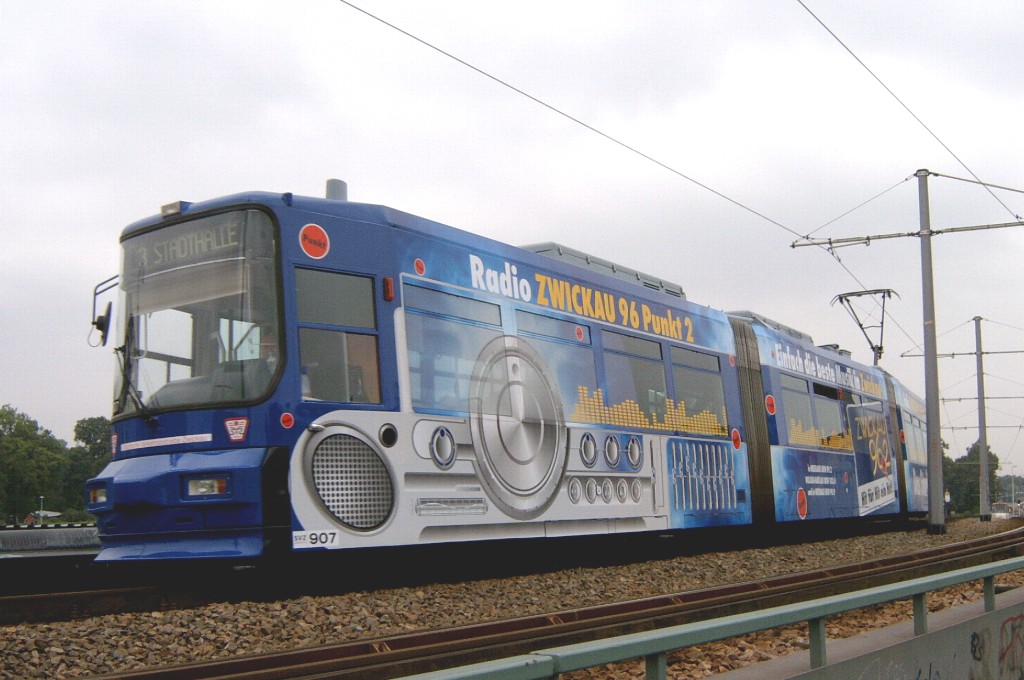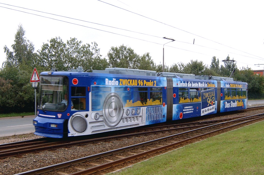 Tw 905 zwischen den Haltestellen IHK/Saarstraße und Zentrum auf der Äußeren Schneeberger Straße. |