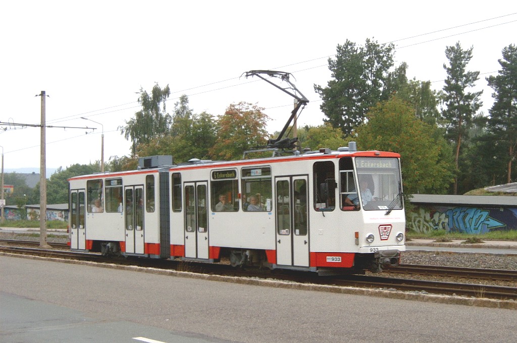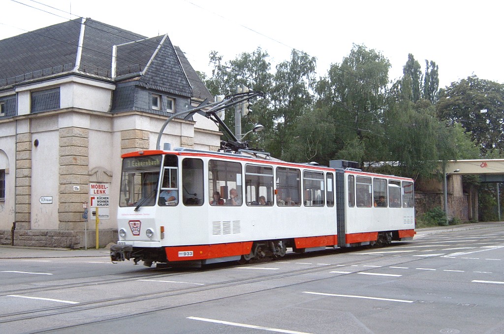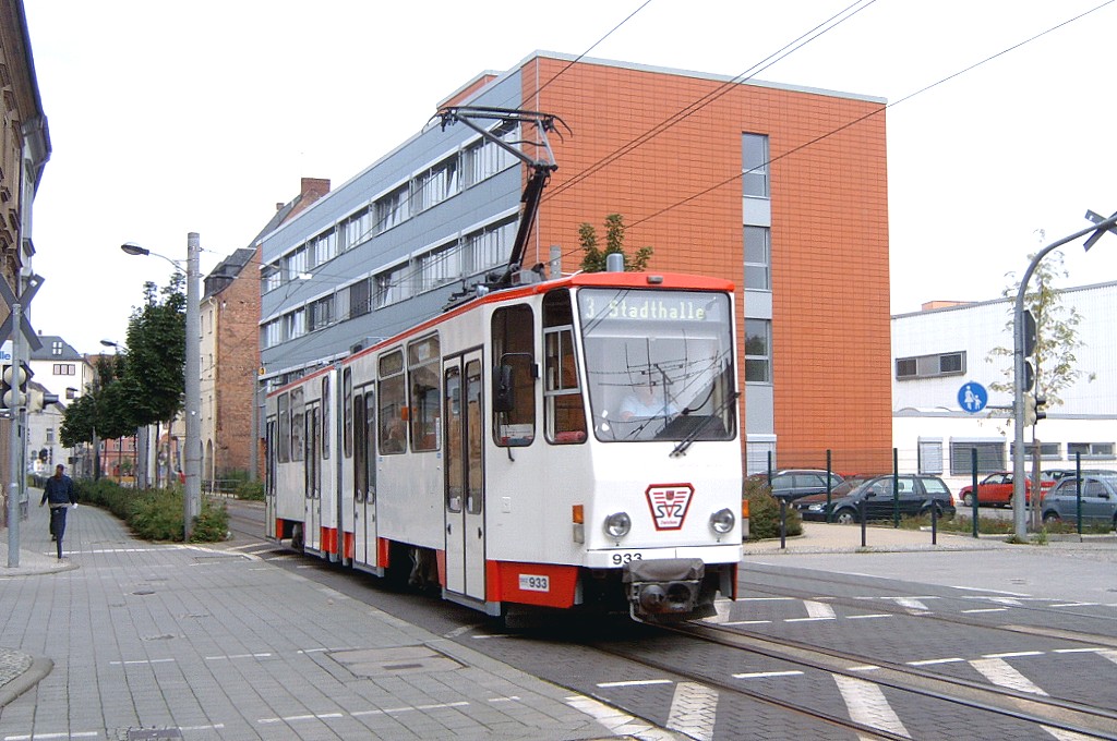 Tw 933 auf der Scheffelstraße zwischen den Haltestellen Westsächsische Hochschule und Talstraße. |