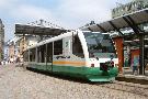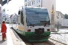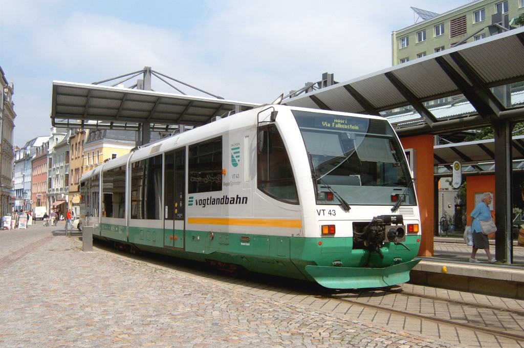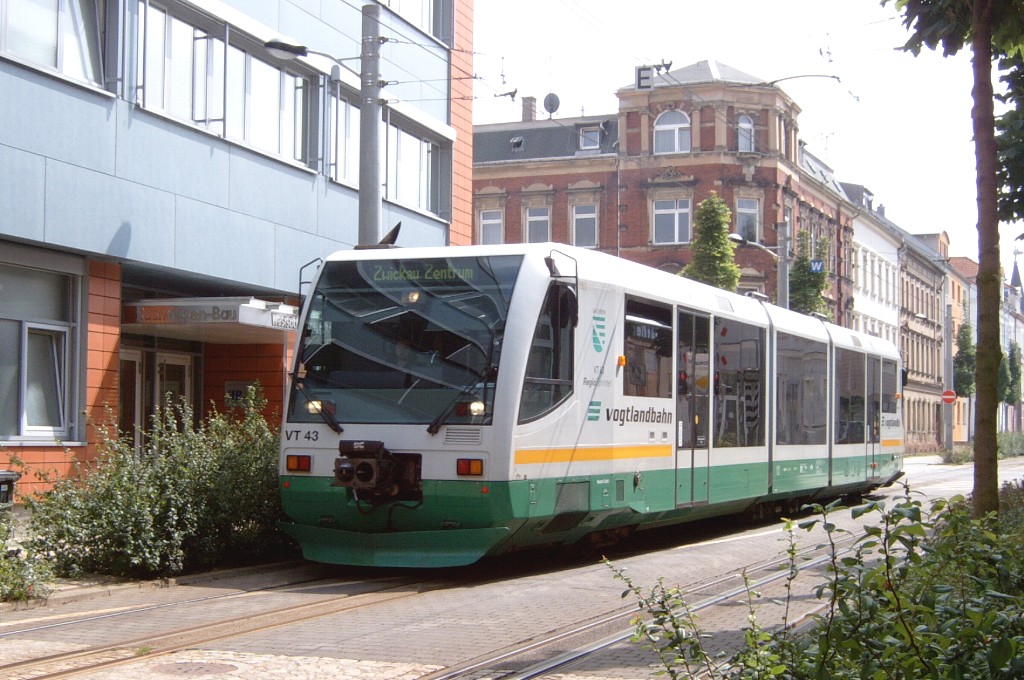 VT 43 an der Haltestelle Zwickau-Zentrum. Entgegen der (falschen) Zielanzeige "Adorf via Falkenstein" fährt er über Plauen - Oelsnitz/V. nach Adorf/V. |