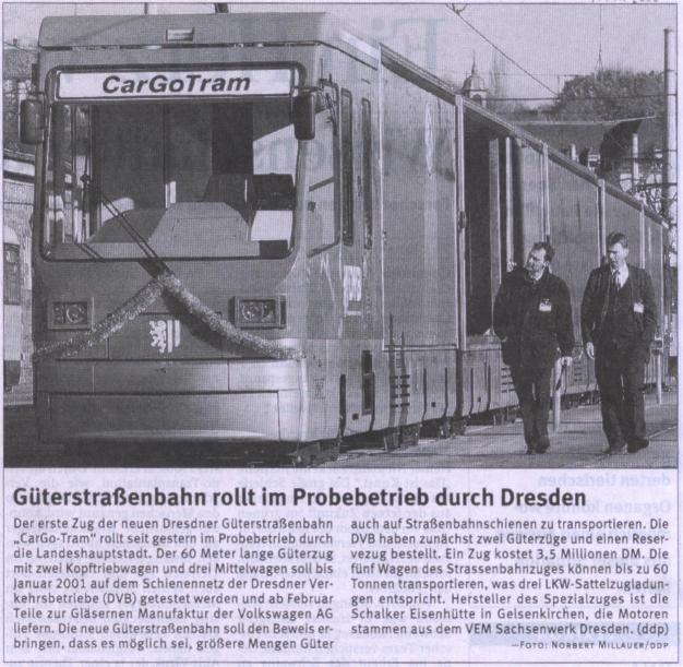 | Dresden | CarGoTram (Präsentation) | Freie Presse | 17.11.2000 | GTw 2001 + GBw 2021 + GBw 2022 + GBw 2023 + GTw 2002 im Betriebshof Trachenberge - 16.11.2000 |