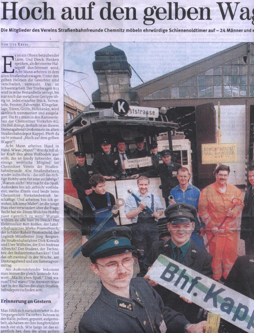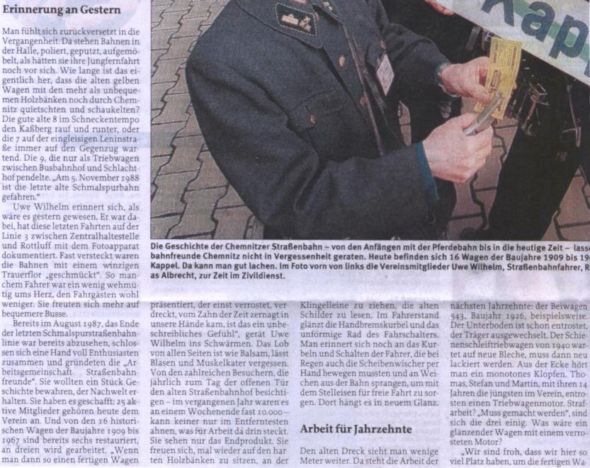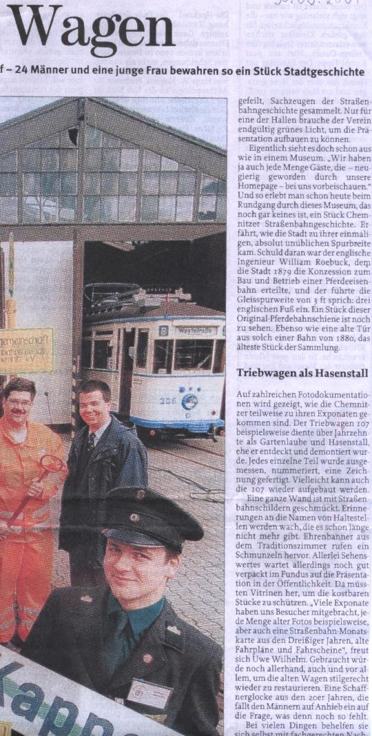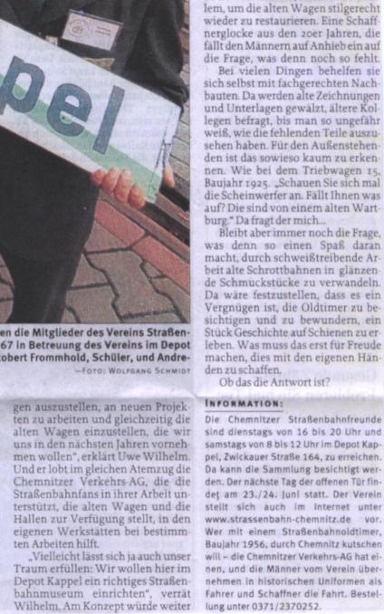 | Chemnitz | AG Straßenbahnfreunde Chemnitz e.V. (Teil 1) (Teil 2) (Teil 3) (Teil 4) | Freie Presse | 30.03.2001 | HTw (1)69, HTw 15, HTw 306 im Betriebshof Kappel |